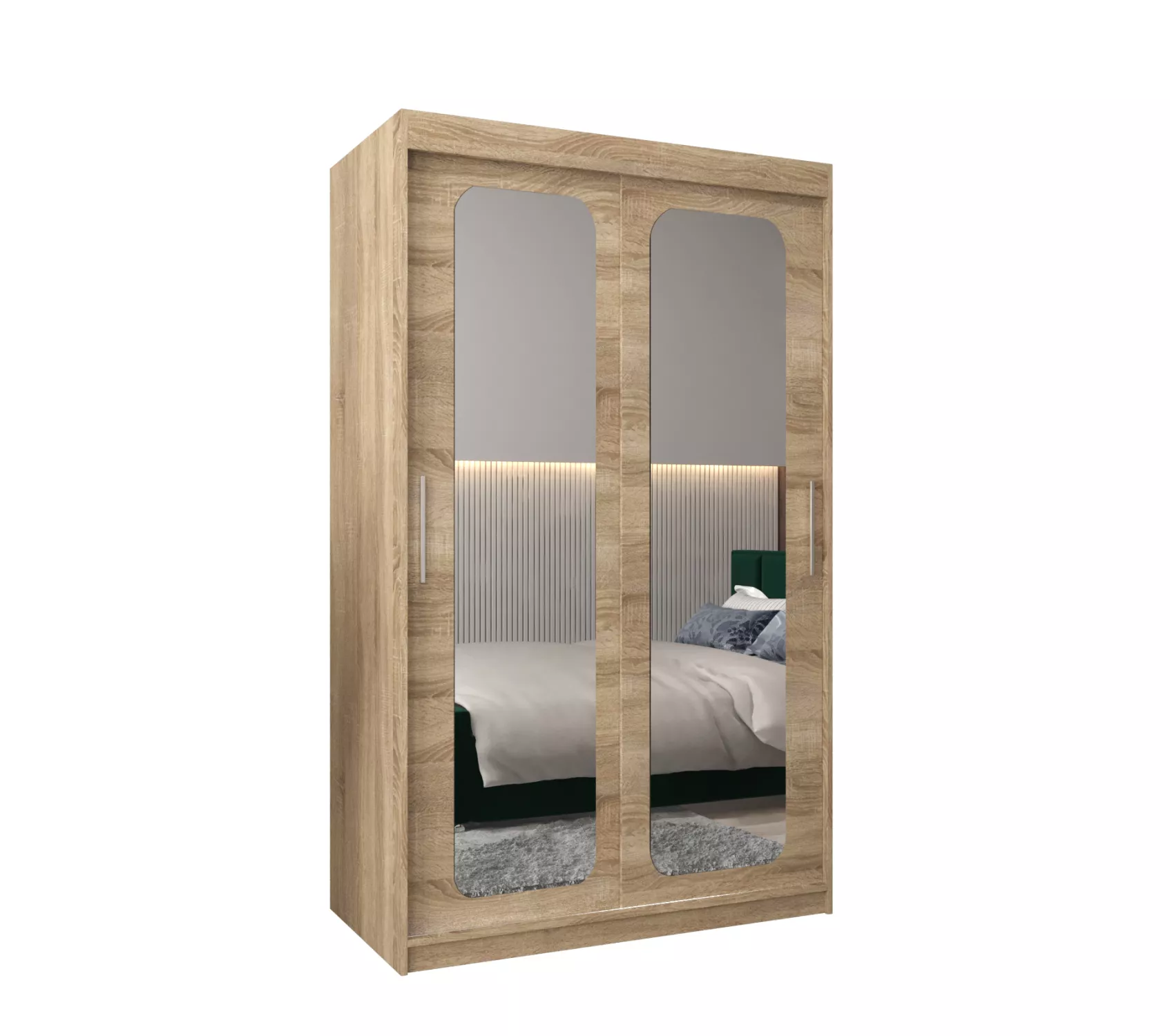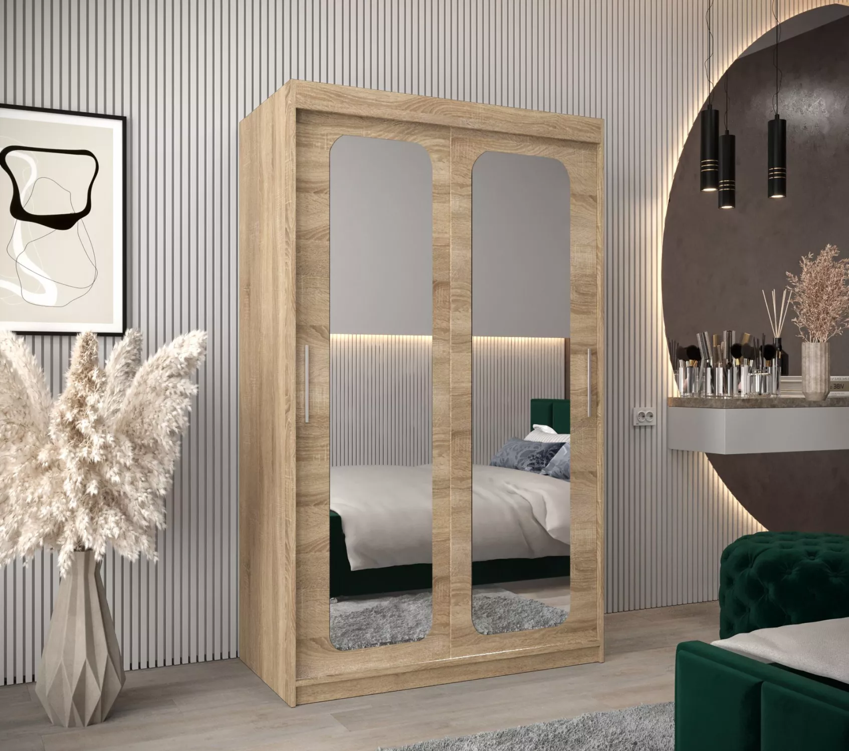 Zrcadlová skříň DONICELA zaujme především moderním designem a oválnými zrcadly. Vnitřek skříně je vybaven policovým systémem a 2 šatními tyčemi.