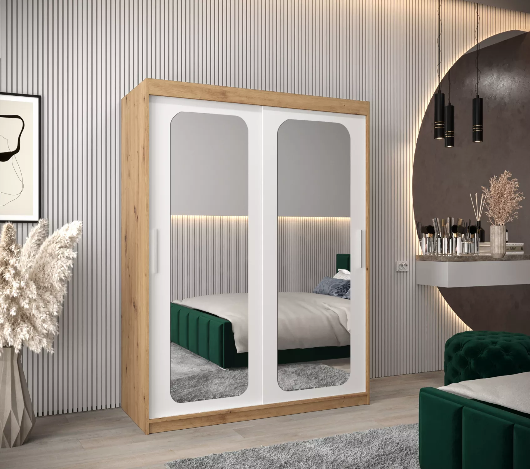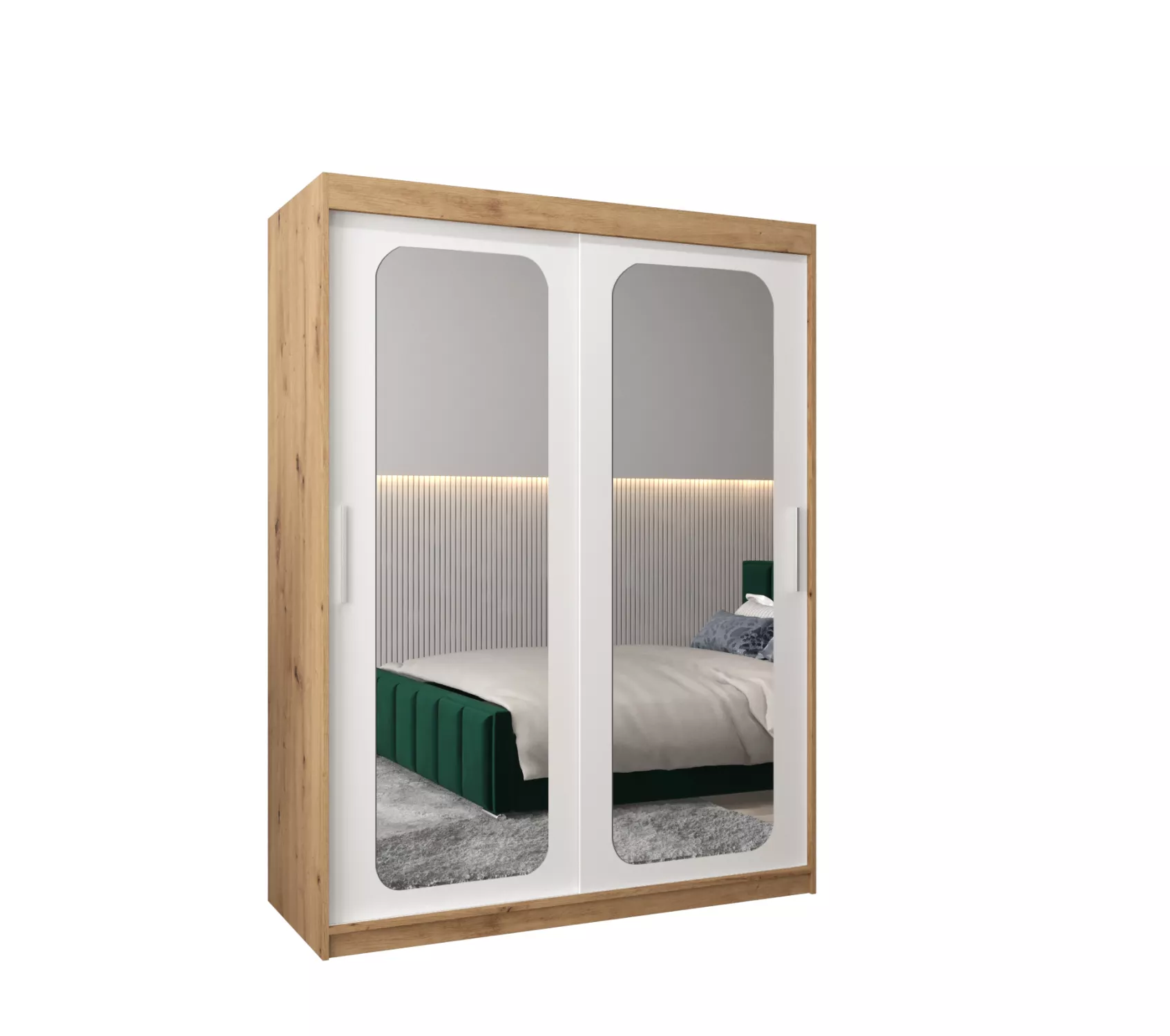 Zrcadlová skříň DONICELA zaujme především moderním designem a oválnými zrcadly. Vnitřek skříně je vybaven policovým systémem a 2 šatními tyčemi.