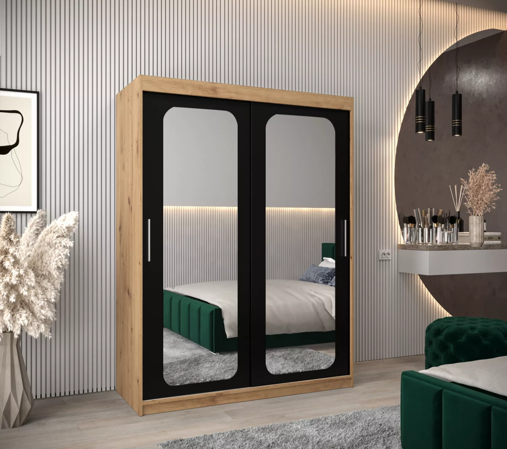Zrcadlová skříň DONICELA zaujme především moderním designem a oválnými zrcadly. Vnitřek skříně je vybaven policovým systémem a 2 šatními tyčemi.
