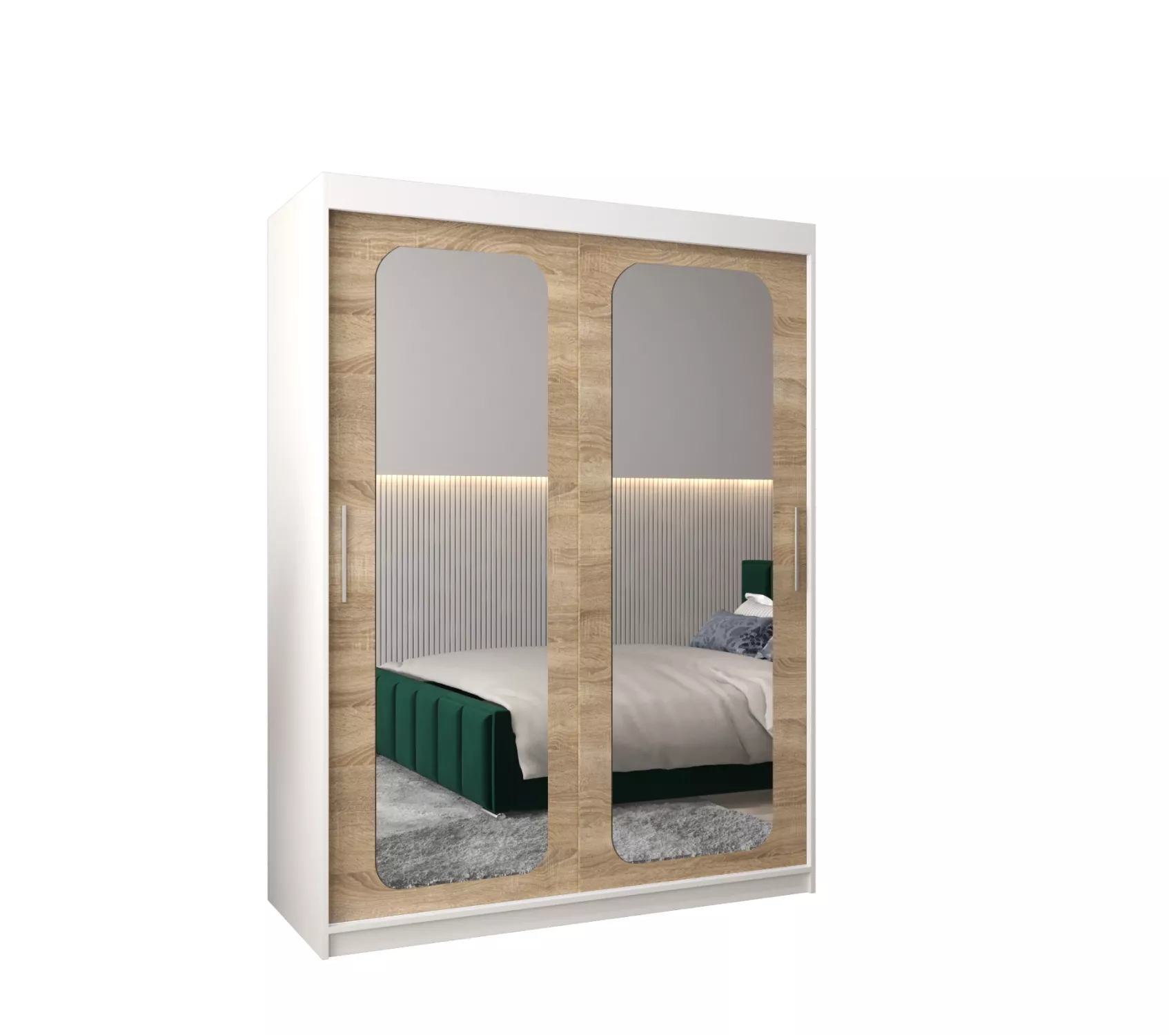 Zrcadlová skříň DONICELA zaujme především moderním designem a oválnými zrcadly. Vnitřek skříně je vybaven policovým systémem a 2 šatními tyčemi.
