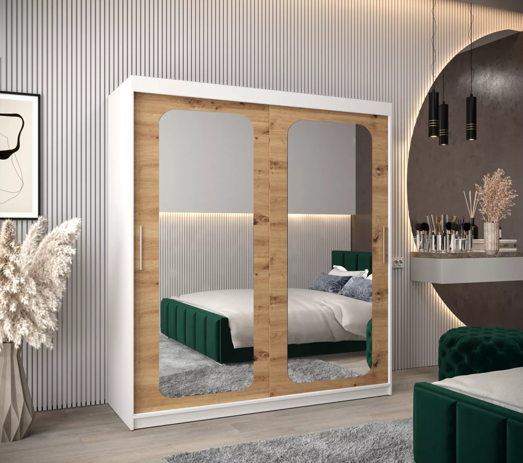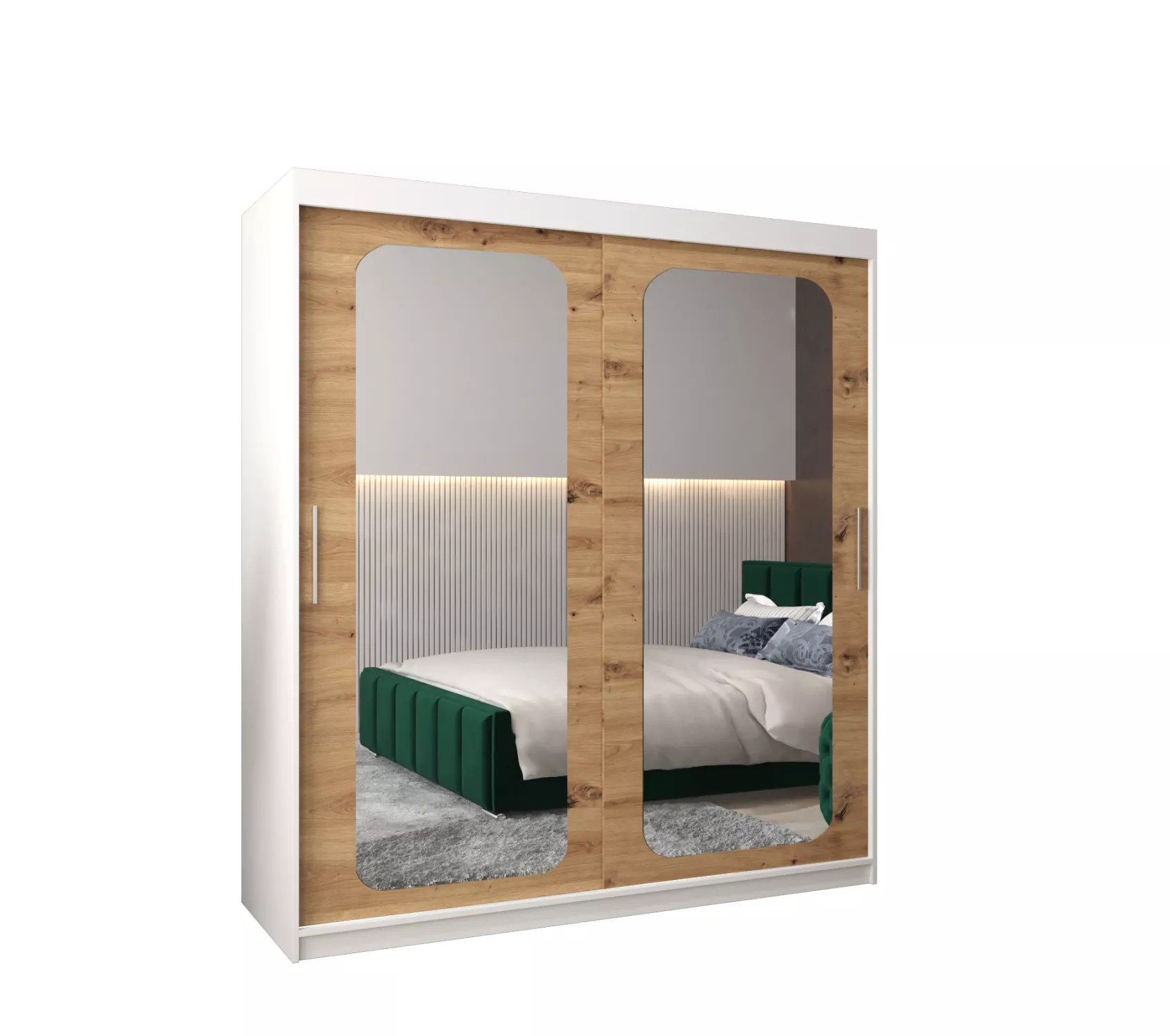 Zrcadlová skříň DONICELA zaujme především moderním designem a oválnými zrcadly. Vnitřek skříně je vybaven policovým systémem a 2 šatními tyčemi.
