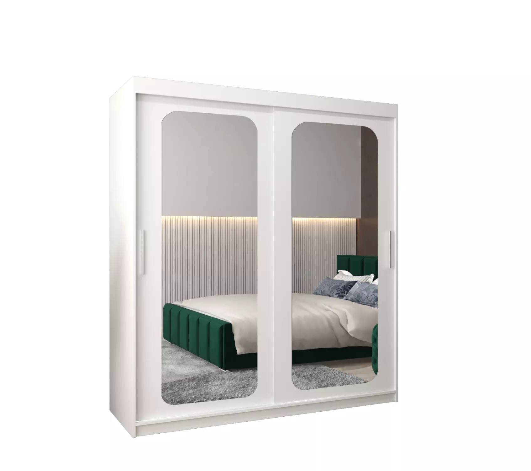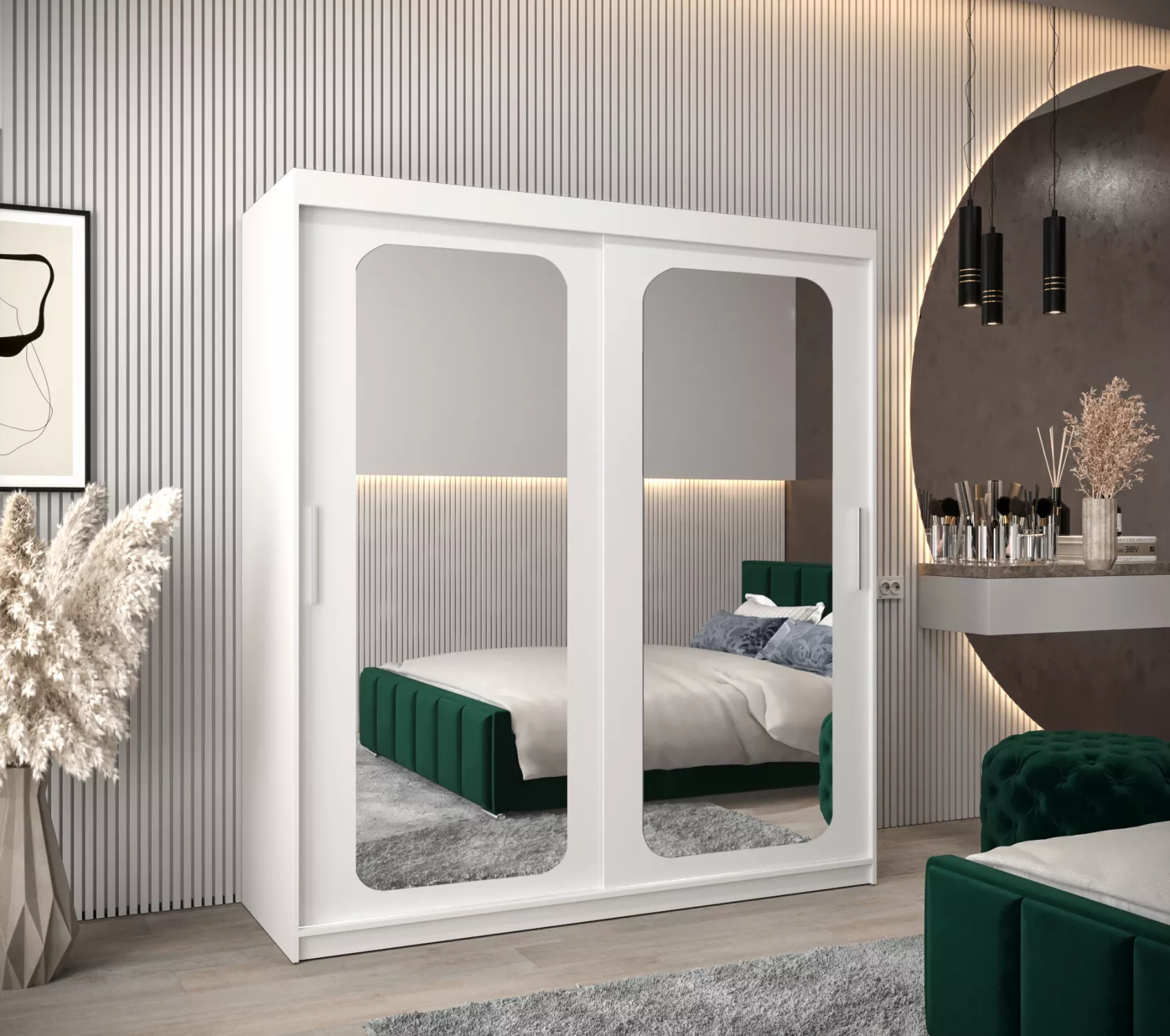 Zrcadlová skříň DONICELA zaujme především moderním designem a oválnými zrcadly. Vnitřek skříně je vybaven policovým systémem a 2 šatními tyčemi.