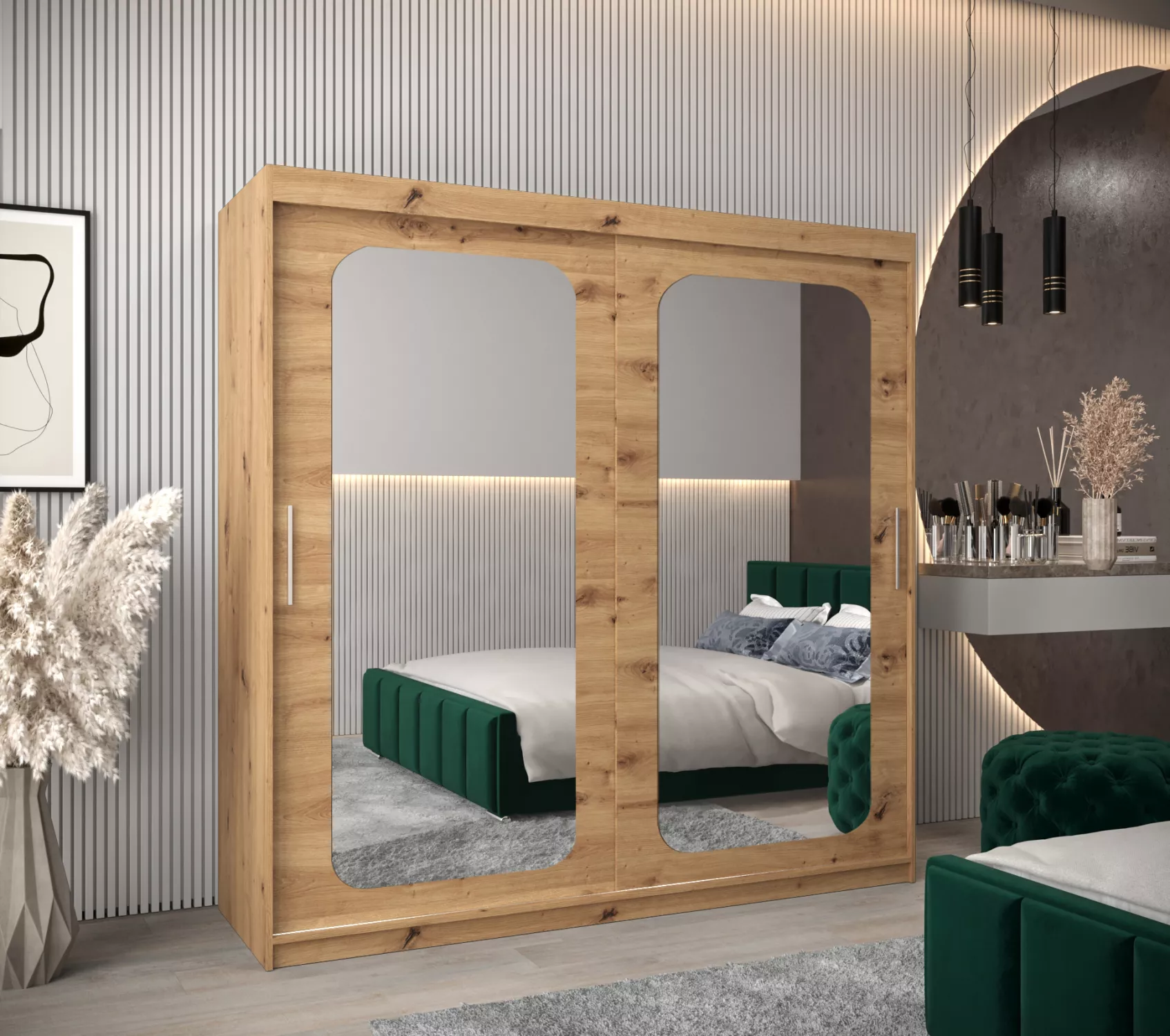 Zrcadlová skříň DONICELA zaujme především moderním designem a oválnými zrcadly. Vnitřek skříně je vybaven policovým systémem a 2 šatními tyčemi.