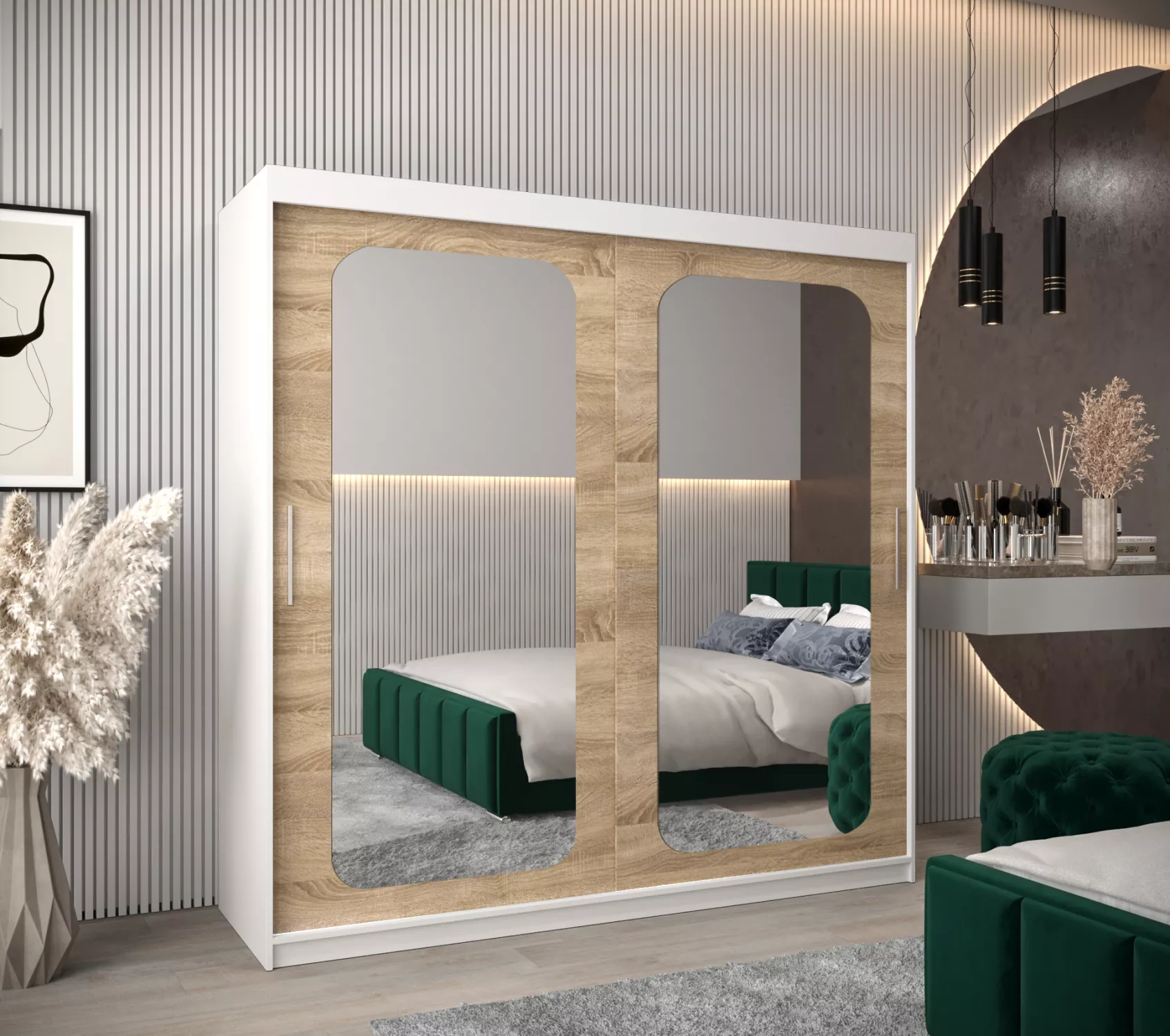 Zrcadlová skříň DONICELA zaujme především moderním designem a oválnými zrcadly. Vnitřek skříně je vybaven policovým systémem a 2 šatními tyčemi.
