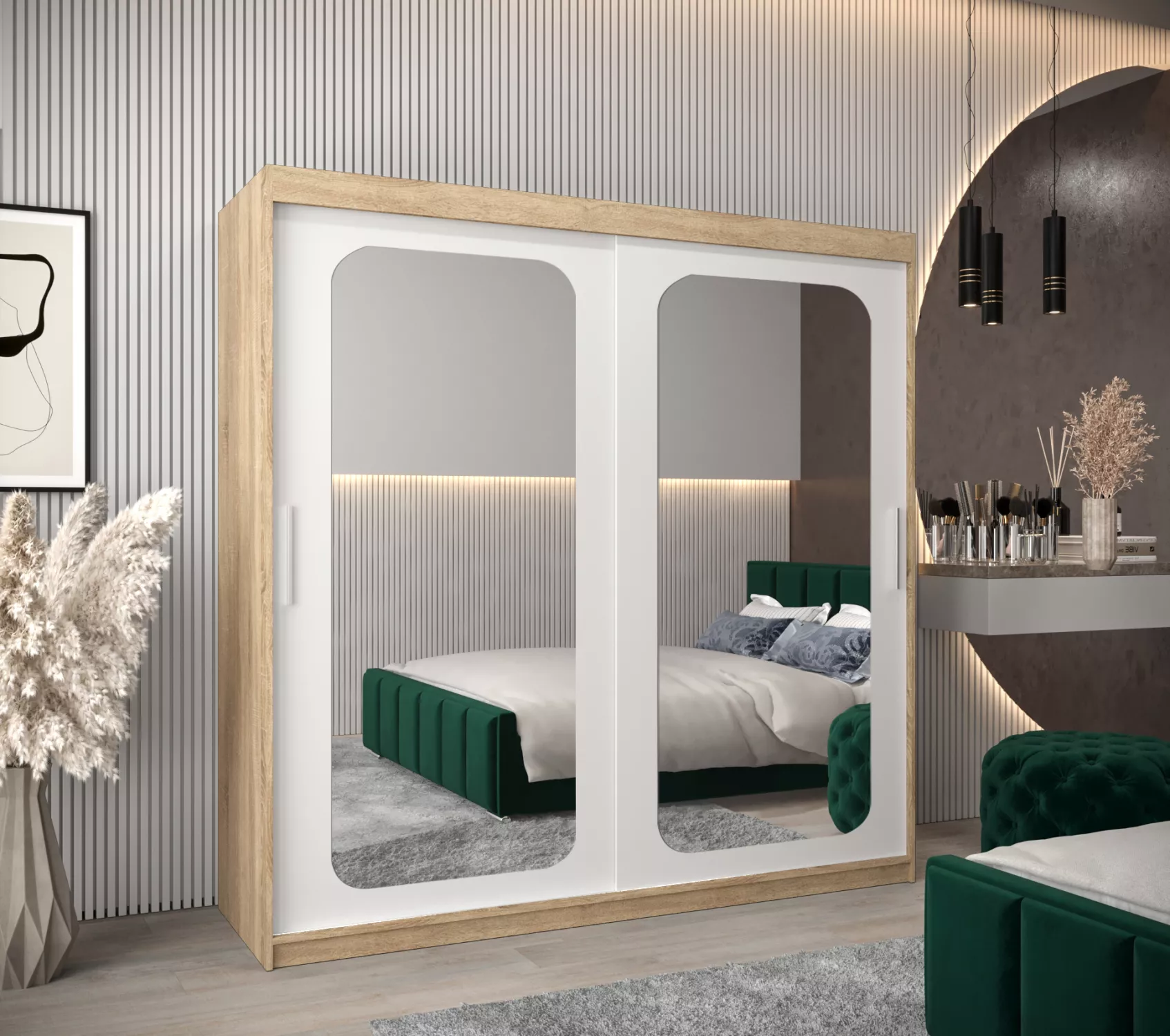 Zrcadlová skříň DONICELA zaujme především moderním designem a oválnými zrcadly. Vnitřek skříně je vybaven policovým systémem a 2 šatními tyčemi.