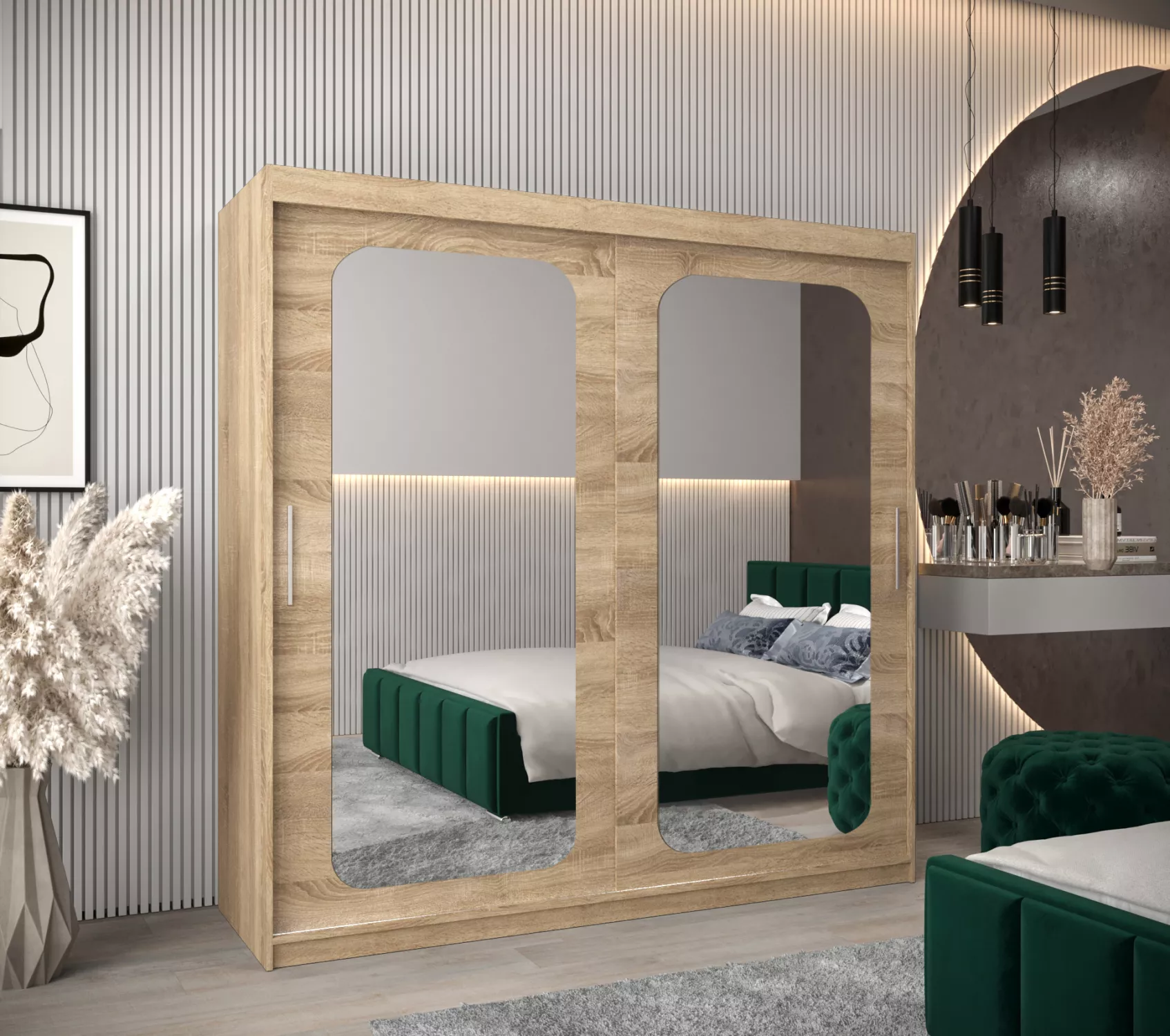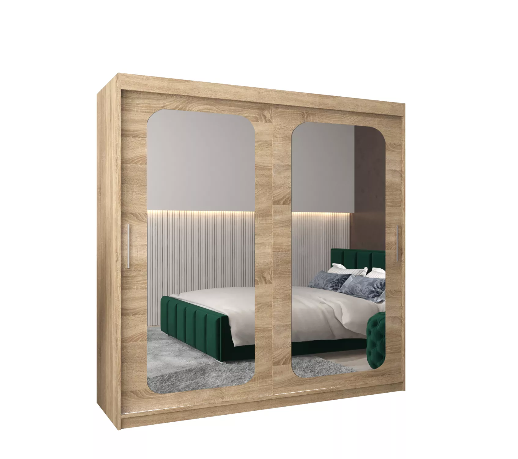 Zrcadlová skříň DONICELA zaujme především moderním designem a oválnými zrcadly. Vnitřek skříně je vybaven policovým systémem a 2 šatními tyčemi.