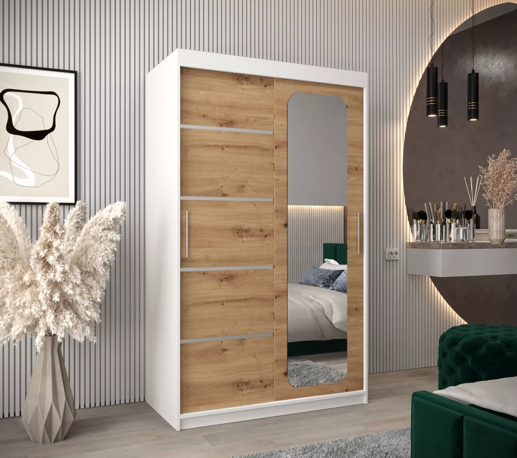 Zrcadlová skříň DONICELA zaujme především moderním designem a ozdobnými lištami. Vnitřek skříně je vybaven policovým systémem a 2 šatními tyčemi.