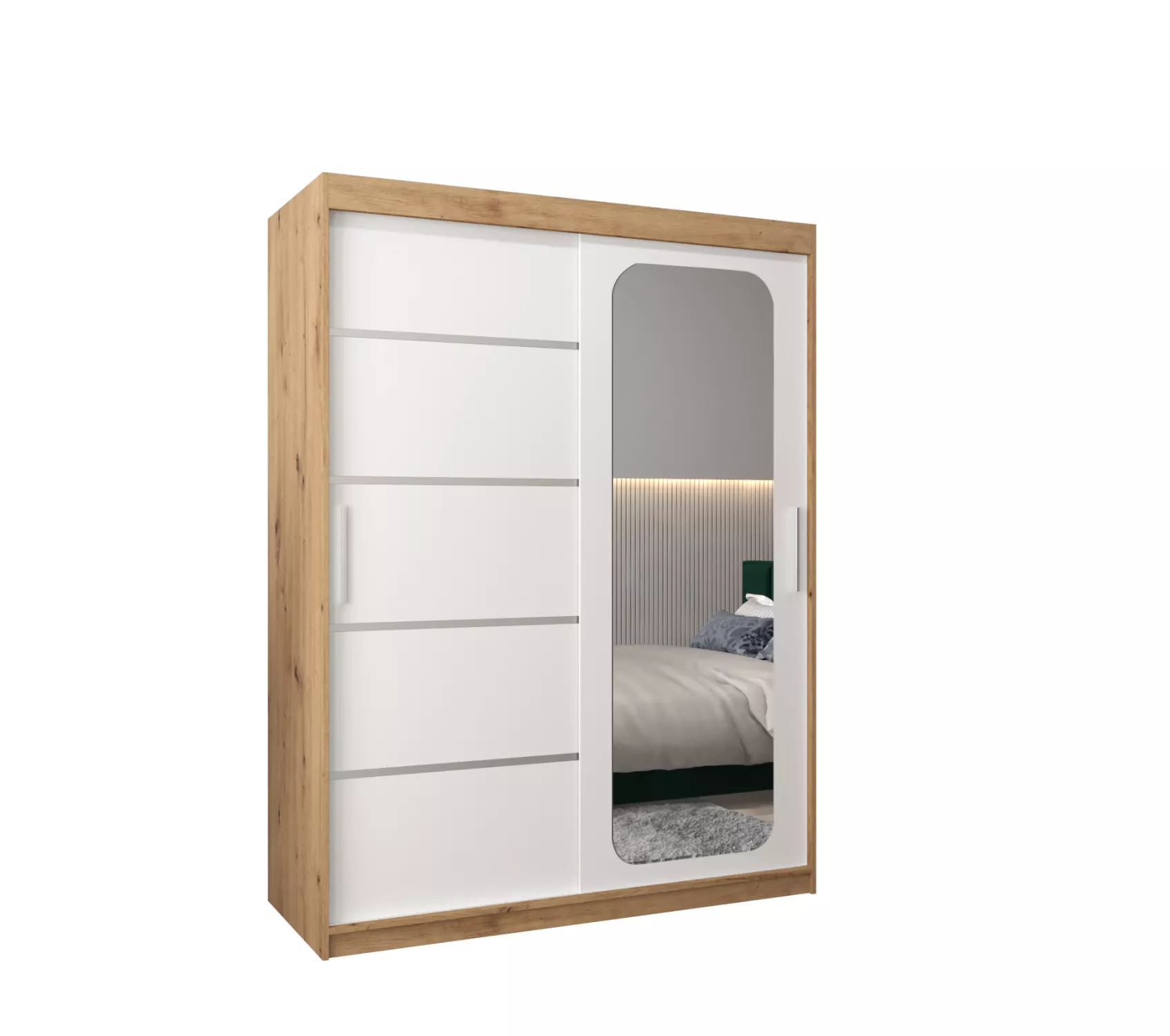 Zrcadlová skříň DONICELA zaujme především moderním designem a ozdobnými lištami. Vnitřek skříně je vybaven policovým systémem a 2 šatními tyčemi.