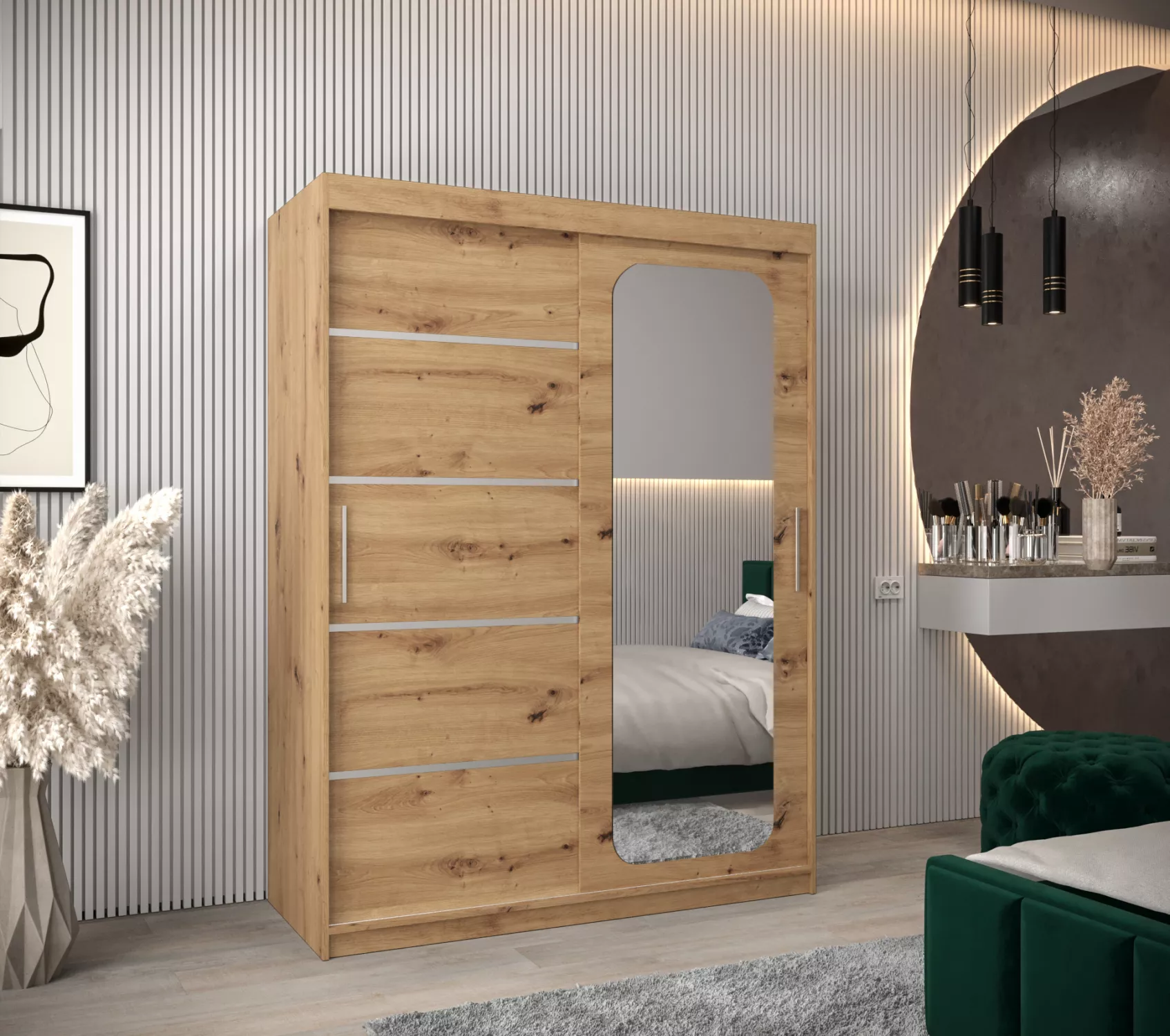 Zrcadlová skříň DONICELA zaujme především moderním designem a ozdobnými lištami. Vnitřek skříně je vybaven policovým systémem a 2 šatními tyčemi.
