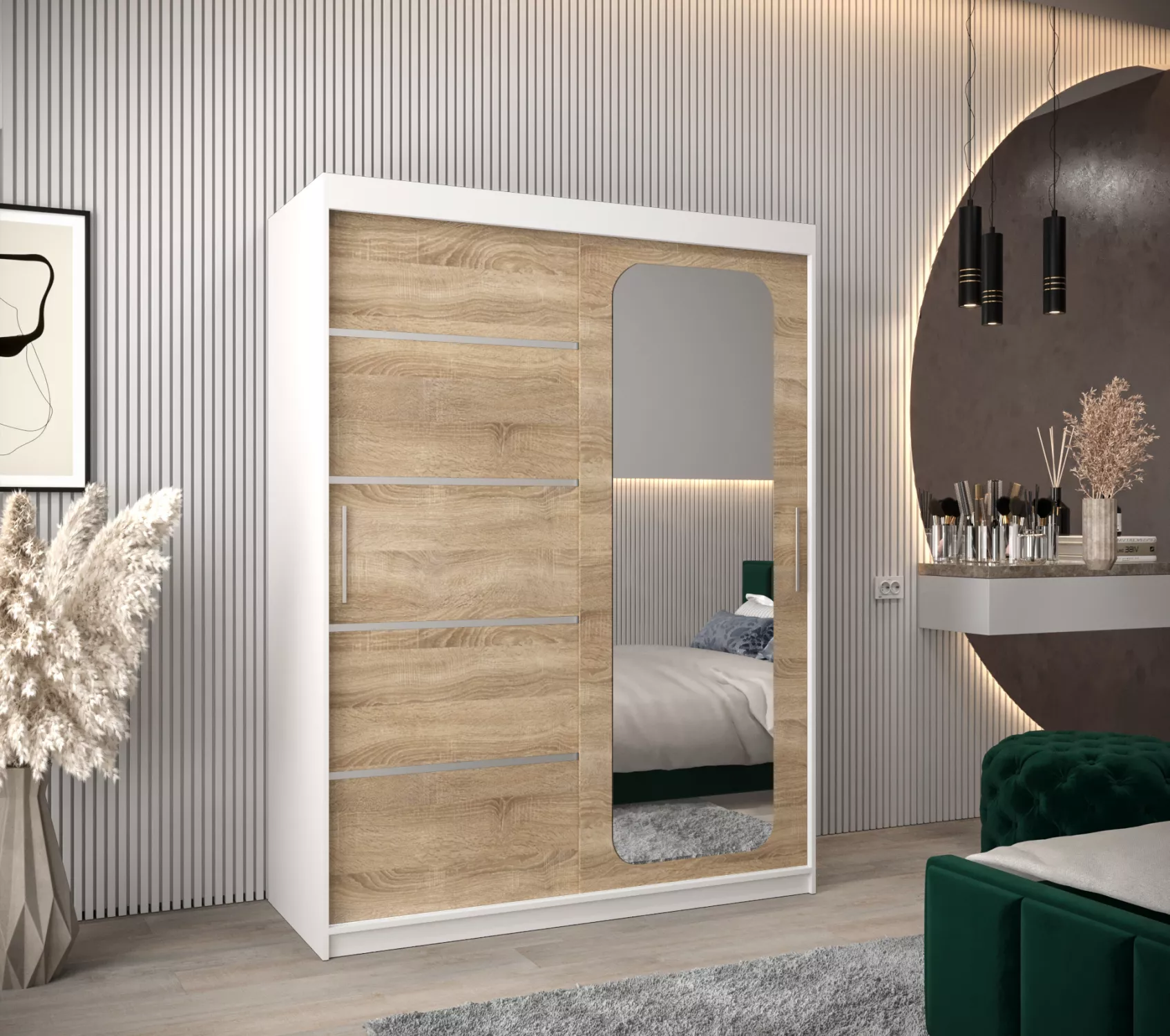 Zrcadlová skříň DONICELA zaujme především moderním designem a ozdobnými lištami. Vnitřek skříně je vybaven policovým systémem a 2 šatními tyčemi.