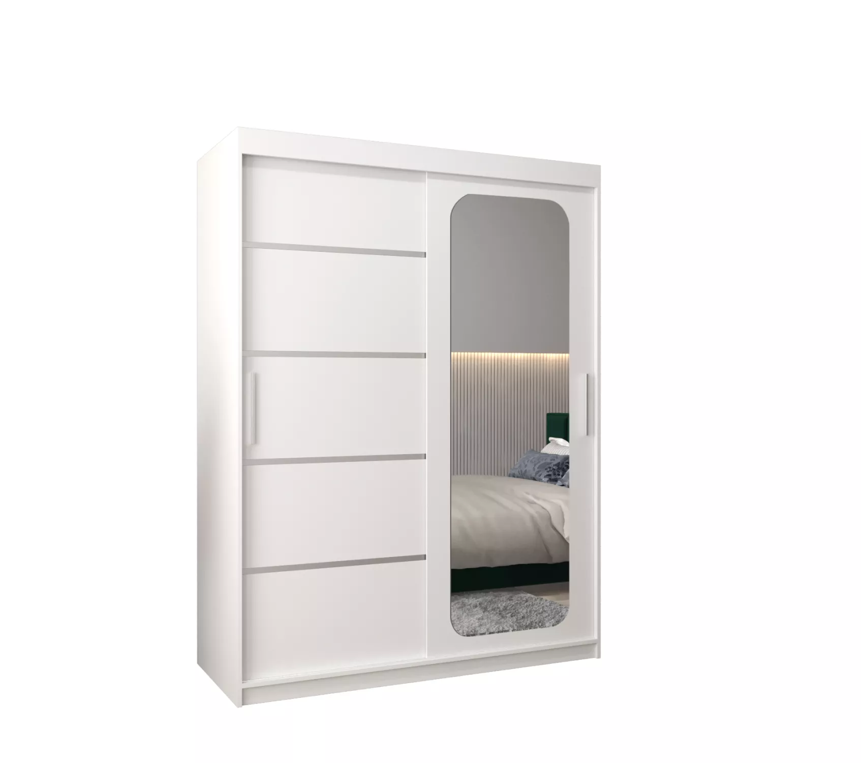 Zrcadlová skříň DONICELA zaujme především moderním designem a ozdobnými lištami. Vnitřek skříně je vybaven policovým systémem a 2 šatními tyčemi.