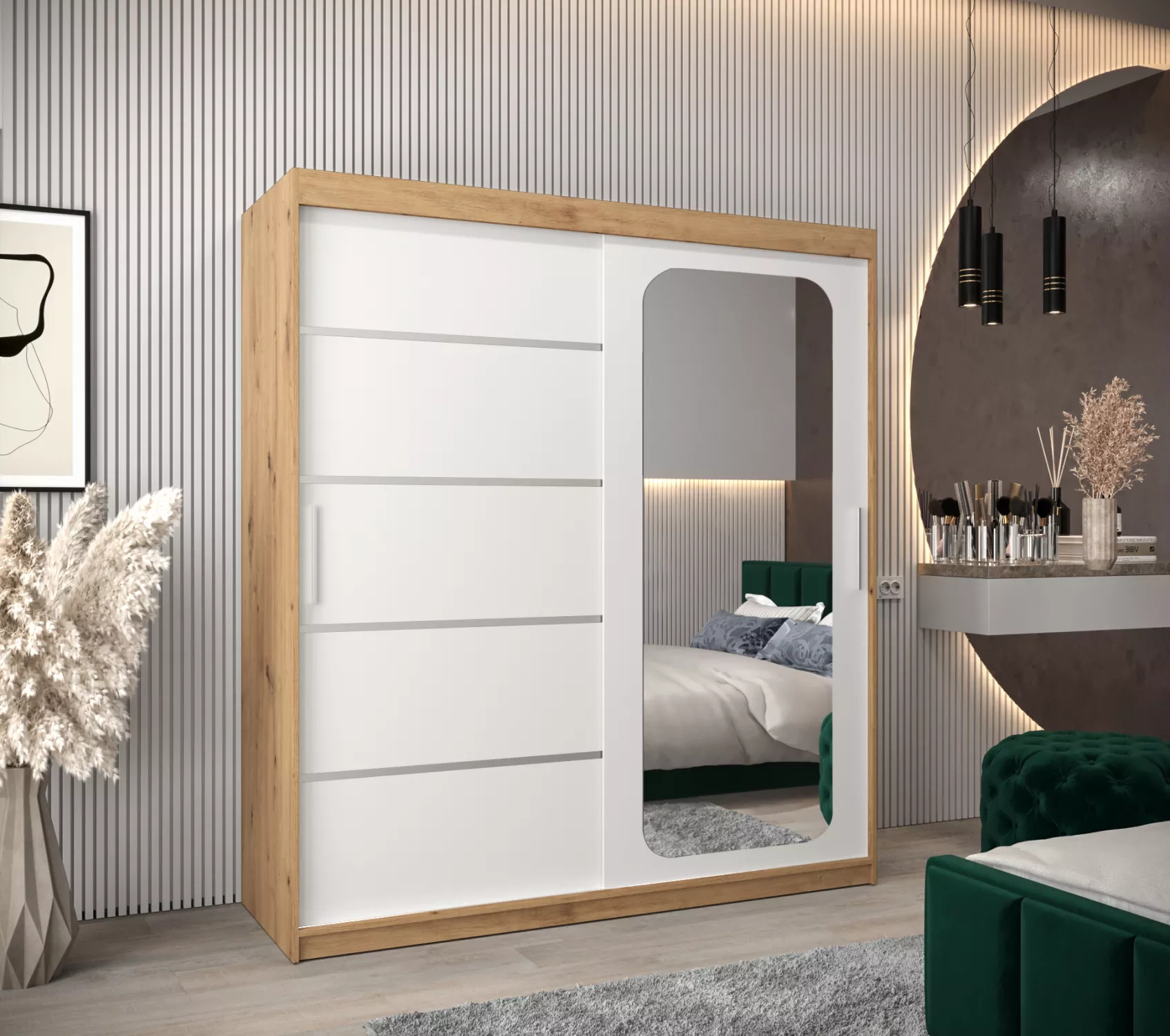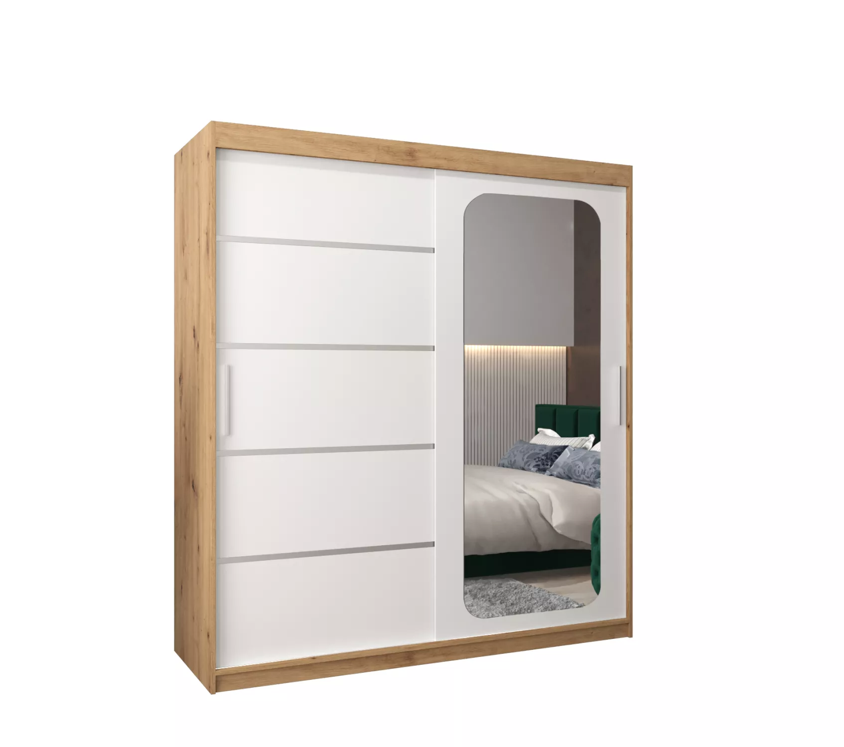 Zrcadlová skříň DONICELA zaujme především moderním designem a ozdobnými lištami. Vnitřek skříně je vybaven policovým systémem a 2 šatními tyčemi.