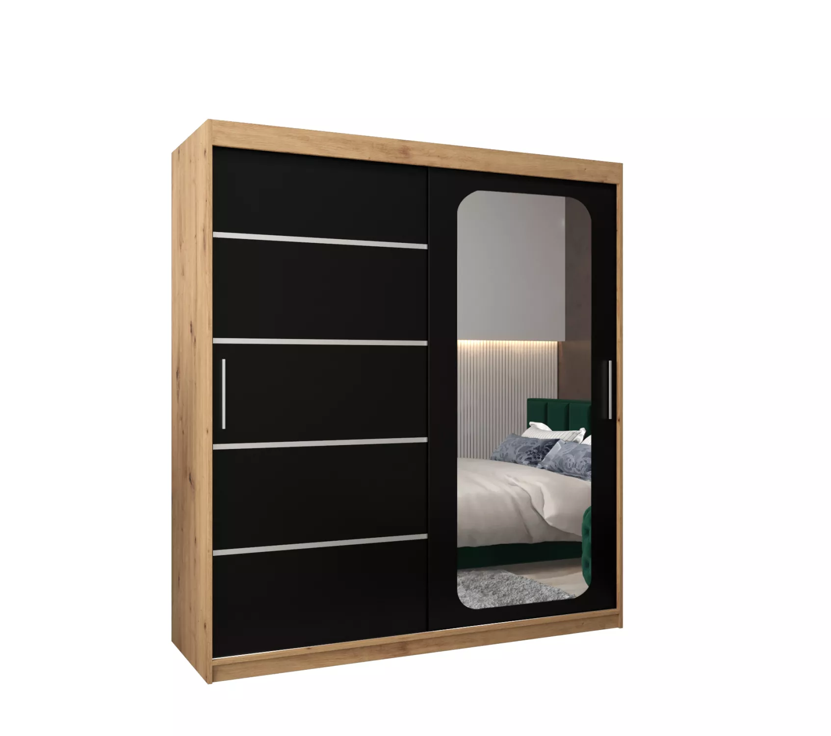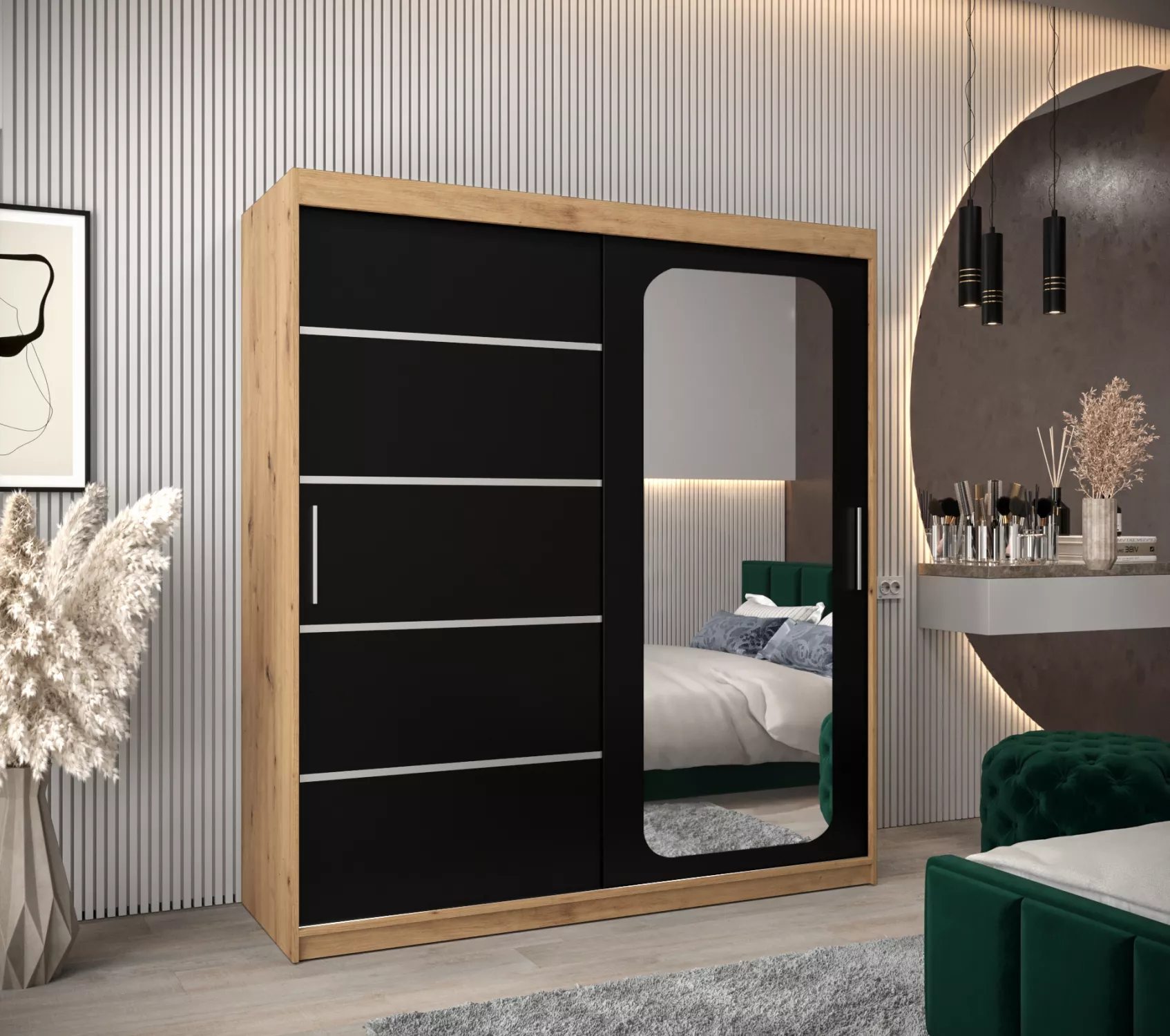 Zrcadlová skříň DONICELA zaujme především moderním designem a ozdobnými lištami. Vnitřek skříně je vybaven policovým systémem a 2 šatními tyčemi.
