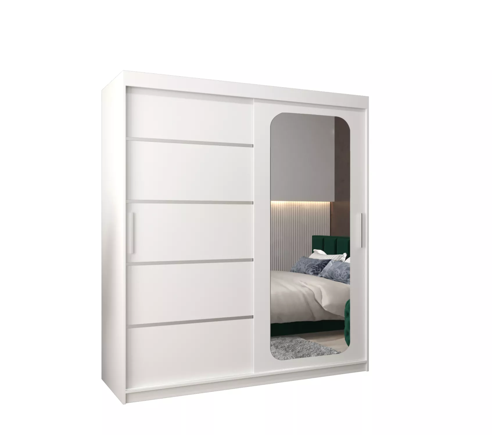 Zrcadlová skříň DONICELA zaujme především moderním designem a ozdobnými lištami. Vnitřek skříně je vybaven policovým systémem a 2 šatními tyčemi.