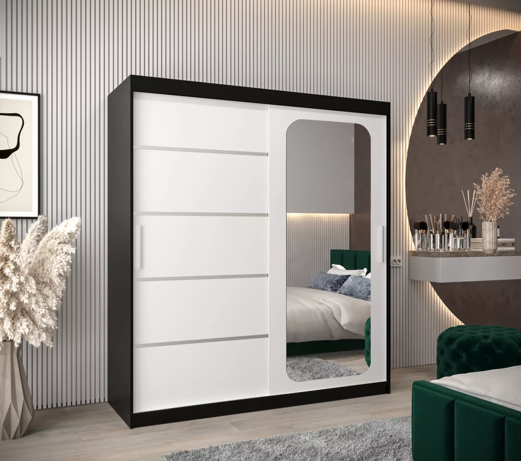 Zrcadlová skříň DONICELA zaujme především moderním designem a ozdobnými lištami. Vnitřek skříně je vybaven policovým systémem a 2 šatními tyčemi.
