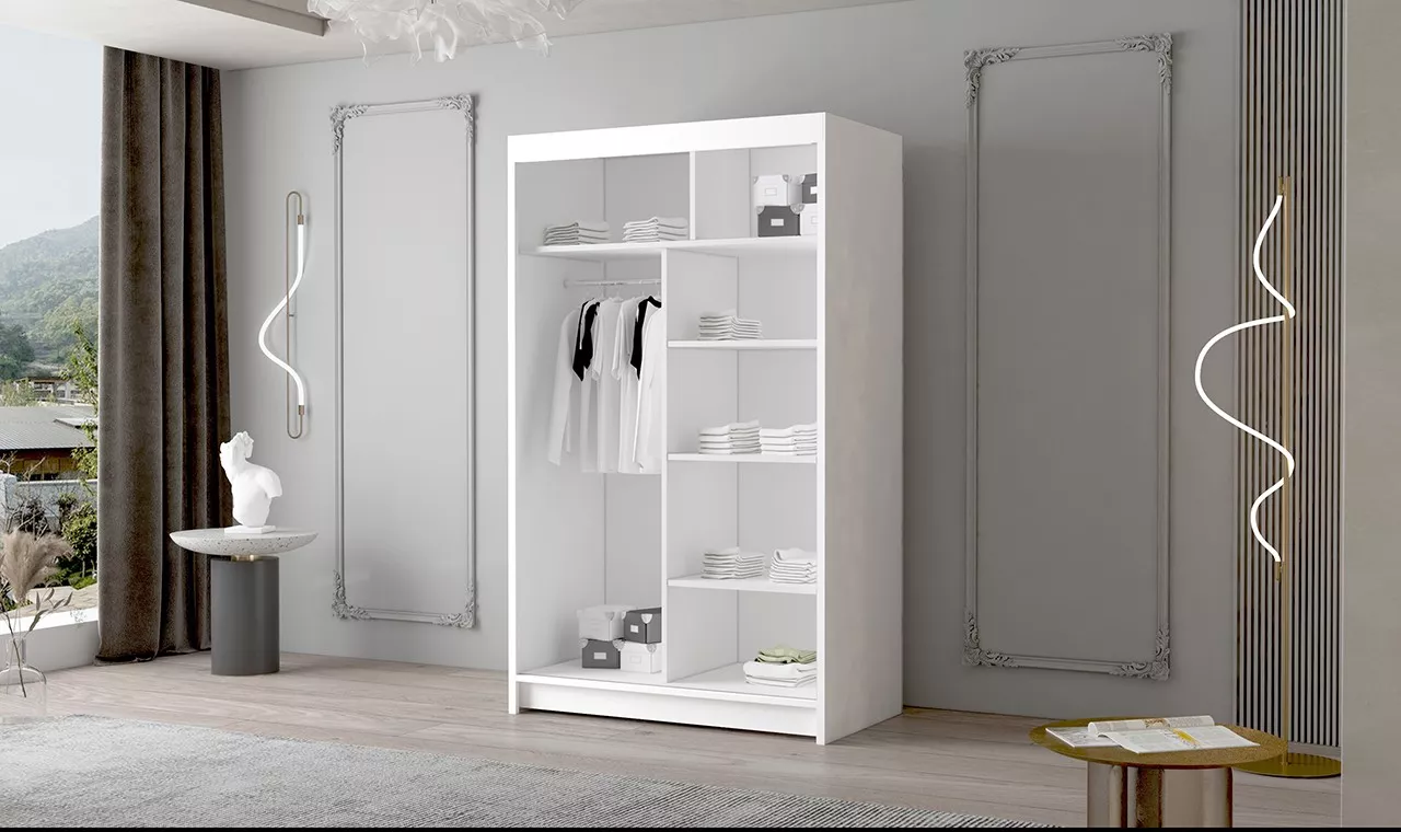 Šatní skříň NICA představuje kvalitní doplněk do moderní ložnice či předsíně. Kromě jedinečného designu nabízí spoustu místa pro uložení oblečení. Skříň disponuje posuvnými dveřmi na hliníkových vodících lištách, otevírání dveří je tak hladké a plynulé. Skříň nemá žádné výrazné úchytky, dveře se otevírají pomocí lišt po stranách. Uvnitř skříně jsou police a šatní tyč.