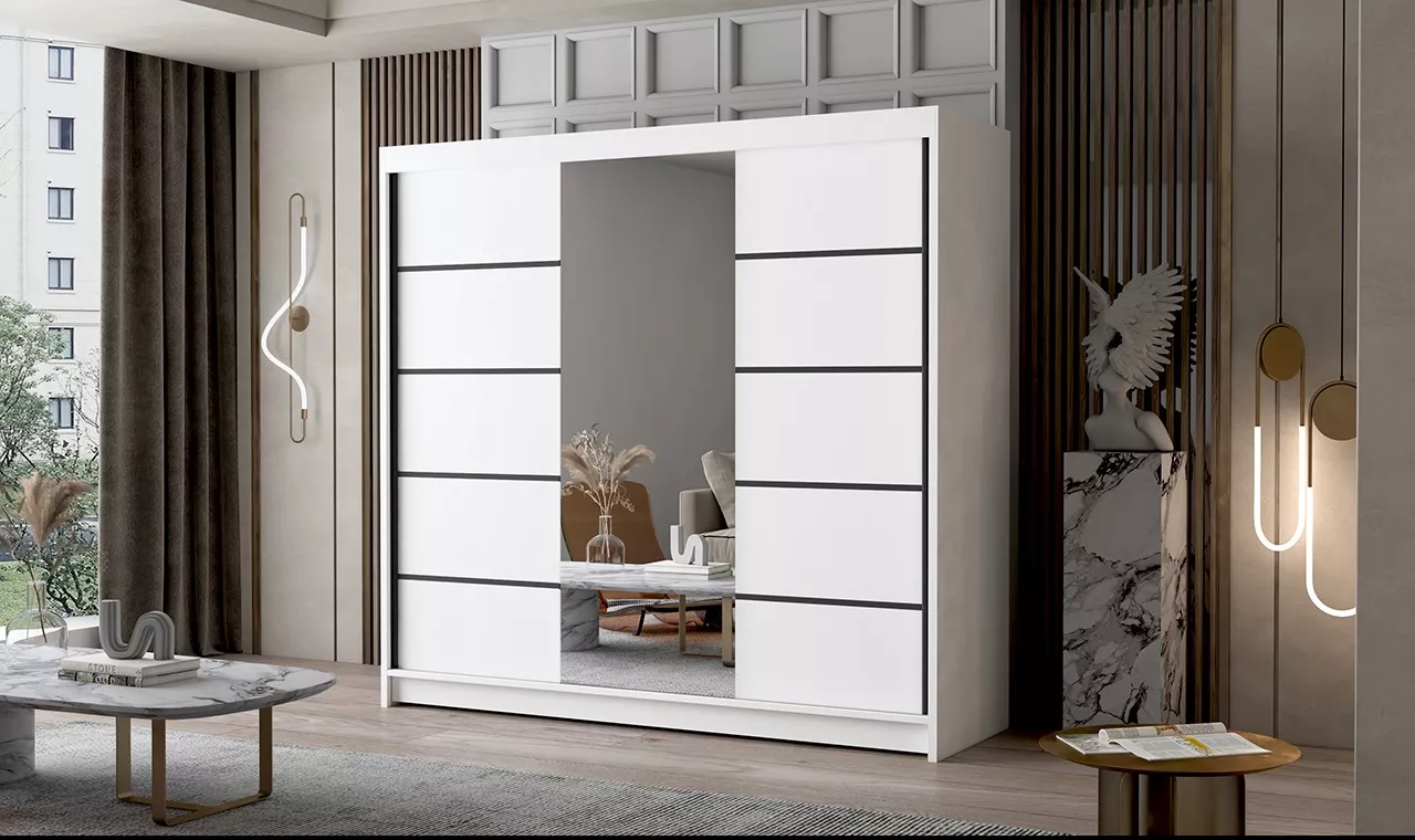 Šatní skříň NICA představuje kvalitní doplněk do moderní ložnice či předsíně. Kromě jedinečného designu nabízí spoustu místa pro uložení oblečení. Skříň disponuje posuvnými dveřmi na hliníkových vodících lištách, otevírání dveří je tak hladké a plynulé. Skříň nemá žádné výrazné úchytky, dveře se otevírají pomocí lišt po stranách. Uvnitř skříně jsou police a šatní tyč.