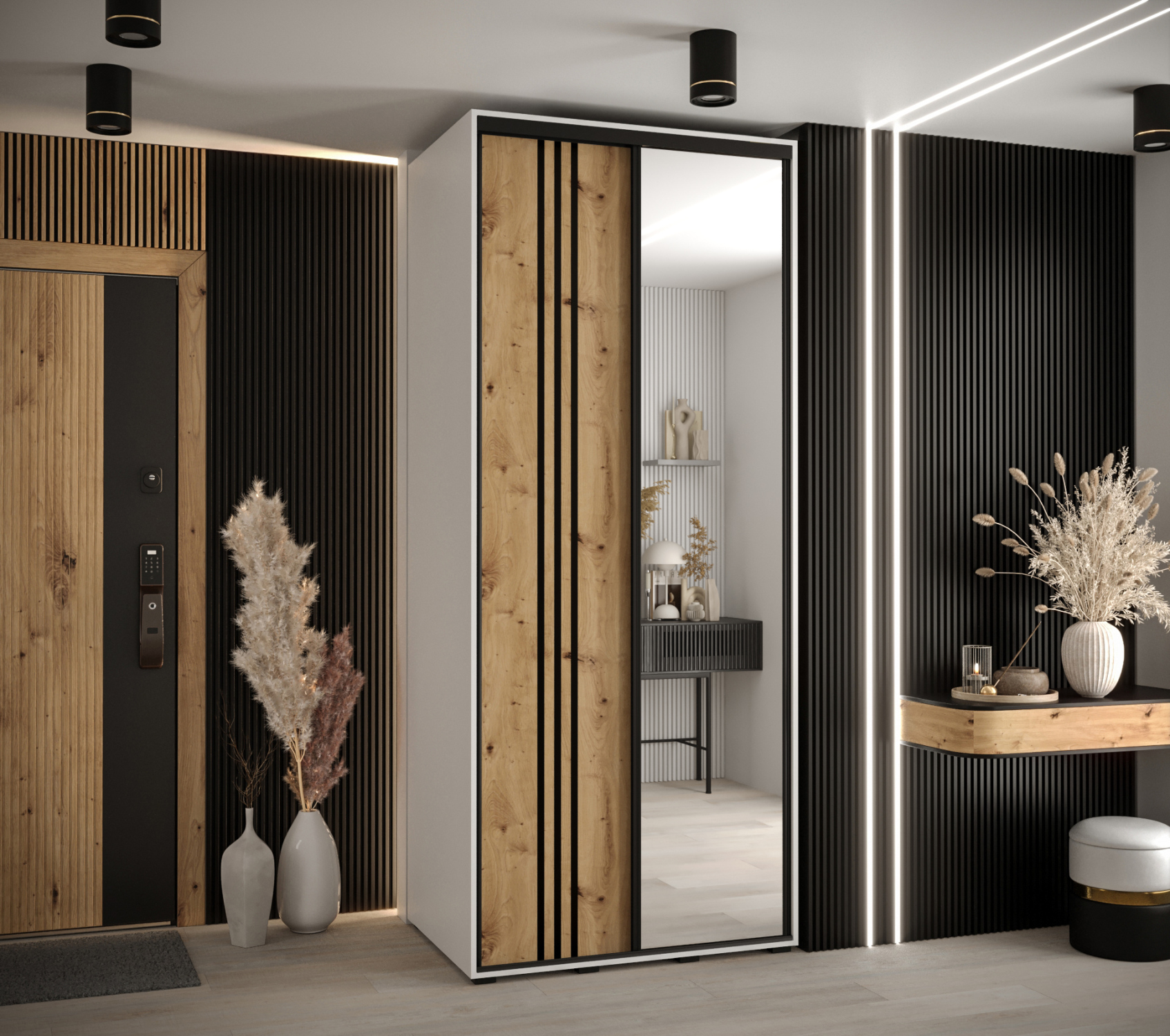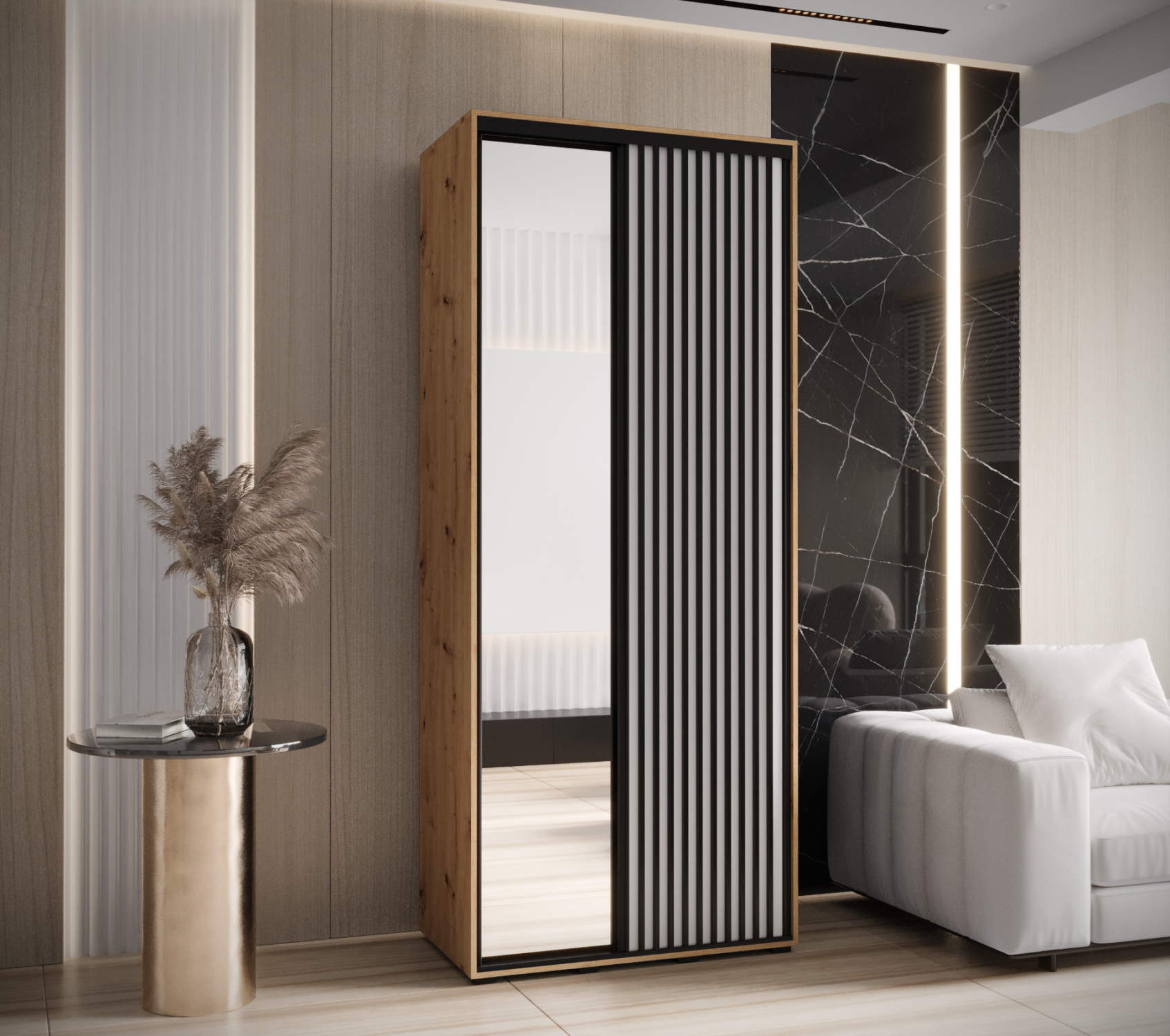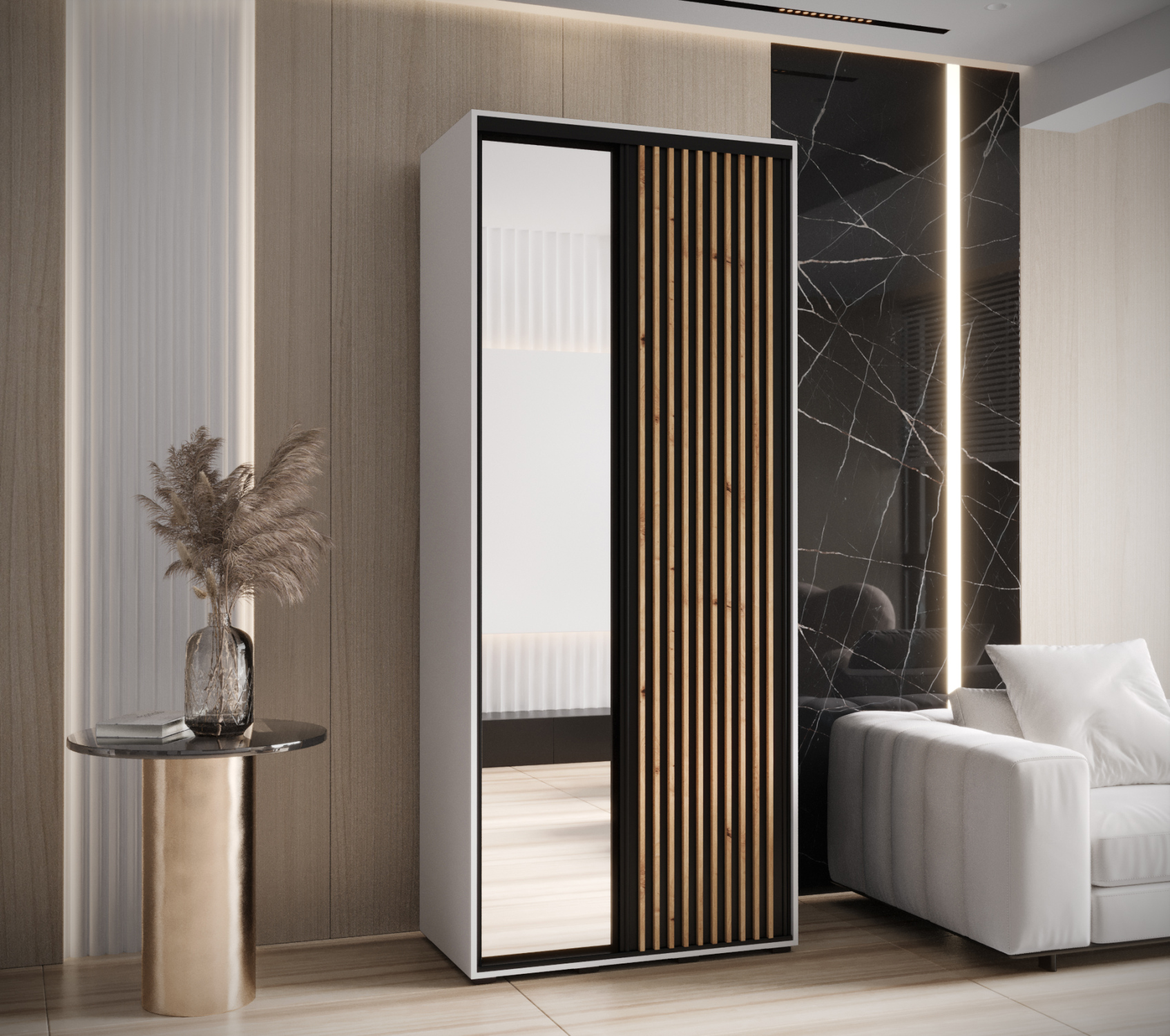 Šatní skříň NICA představuje kvalitní doplněk do moderní ložnice či předsíně. Kromě jedinečného designu nabízí spoustu místa pro uložení oblečení. Skříň disponuje posuvnými dveřmi na hliníkových vodících lištách, otevírání dveří je tak hladké a plynulé. Skříň nemá žádné výrazné úchytky, dveře se otevírají pomocí lišt po stranách. Uvnitř skříně jsou police a šatní tyč.