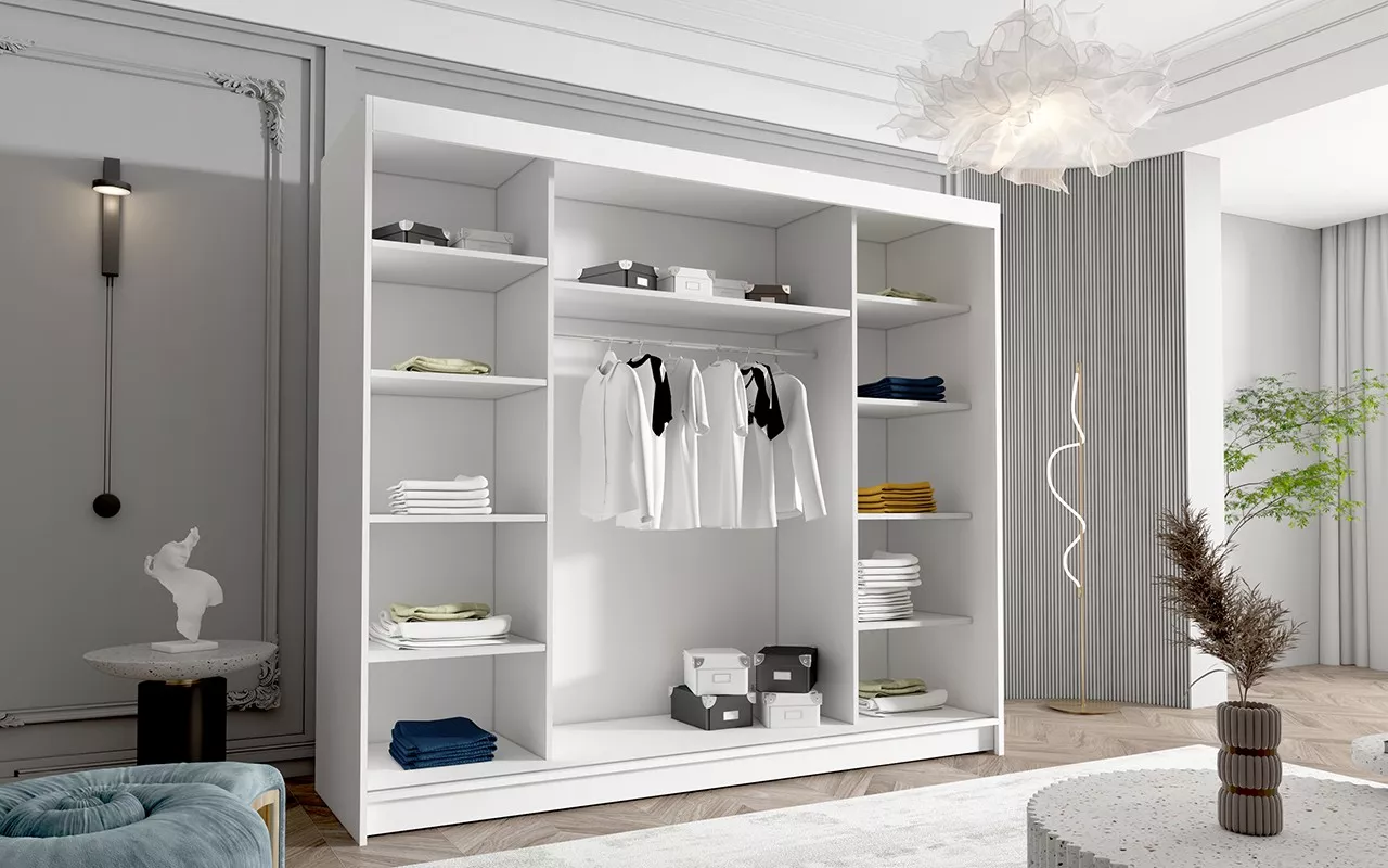 Šatní skříň NICA představuje kvalitní doplněk do moderní ložnice či předsíně. Kromě jedinečného designu nabízí spoustu místa pro uložení oblečení. Skříň disponuje posuvnými dveřmi na hliníkových vodících lištách, otevírání dveří je tak hladké a plynulé. Skříň nemá žádné výrazné úchytky, dveře se otevírají pomocí lišt po stranách. Uvnitř skříně jsou police a šatní tyč.