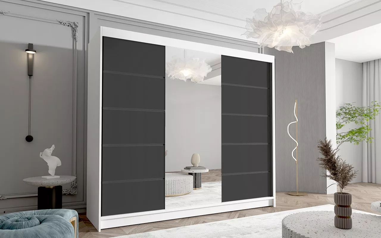 Třídveřová skříň se zrcadlem NICA - šířka 250 cm, bílá / černá