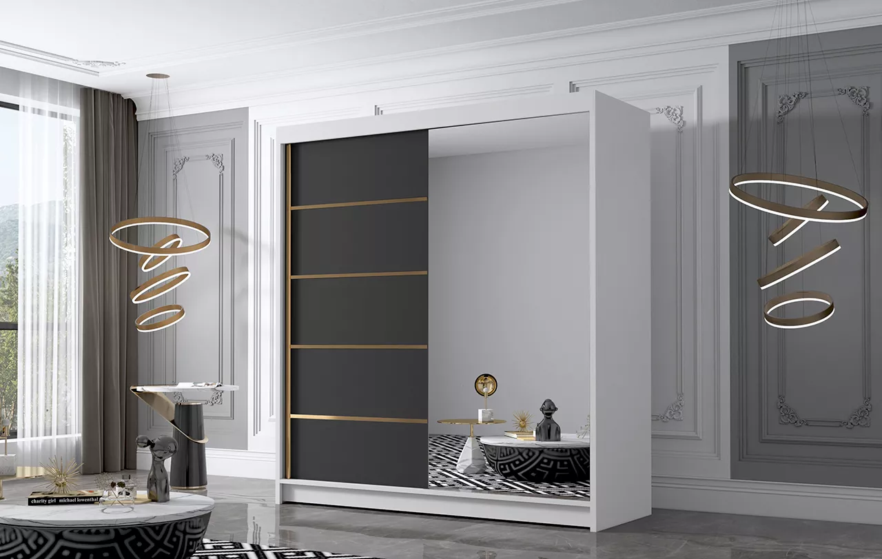 Šatní skříň se zrcadlem MILINA - 180 cm, bílá / černá