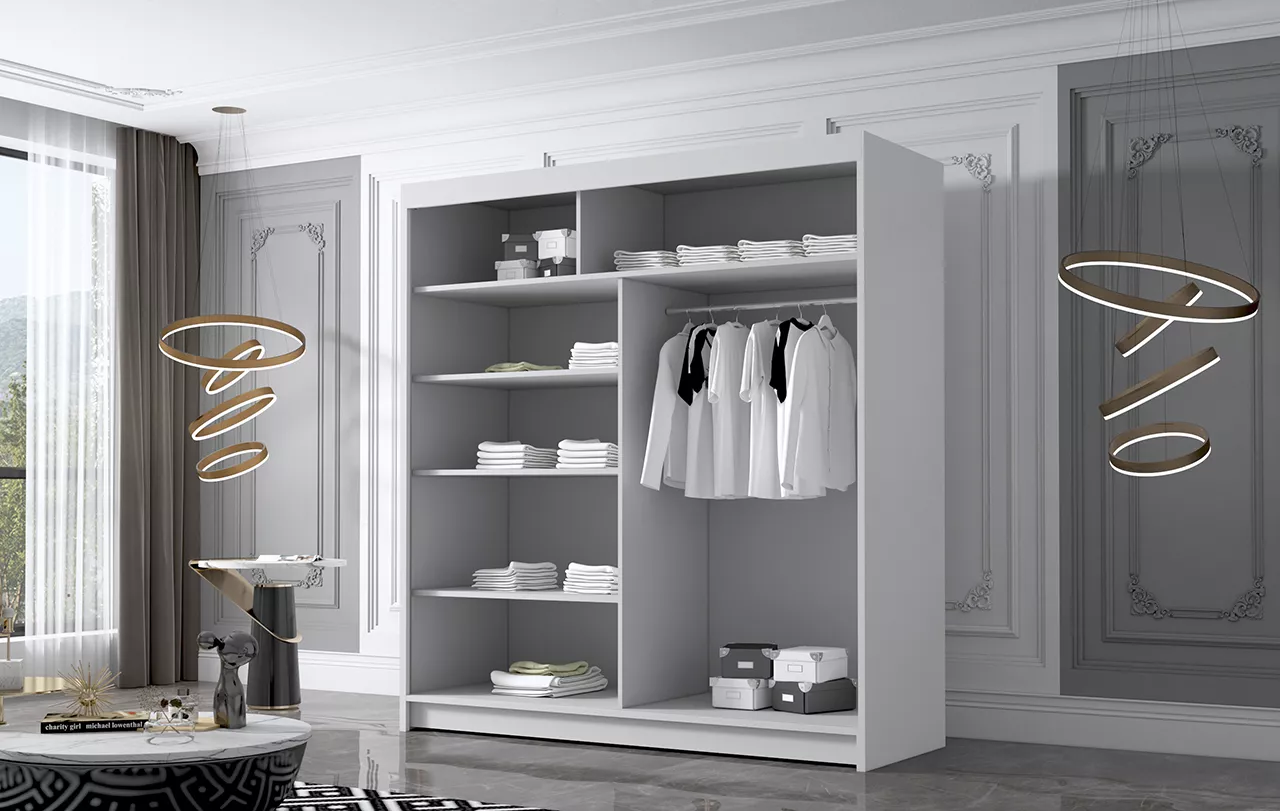 Šatní skříň MILINA skvěle doplní váš interiér. Praktické posuvné dveře oceníte v boji s nedostatkem místa. Nabídka se vyznačuje nejen moderním designem, ale také stabilní strukturou. Uvnitř skříně jsou police a šatní tyč.