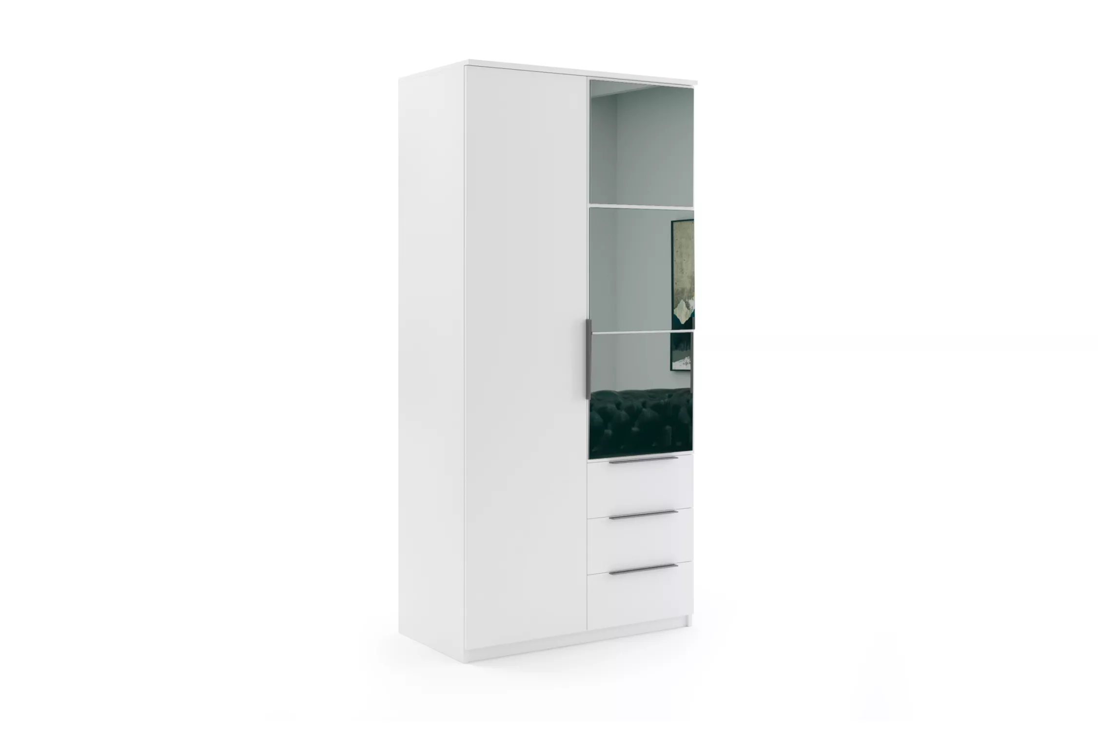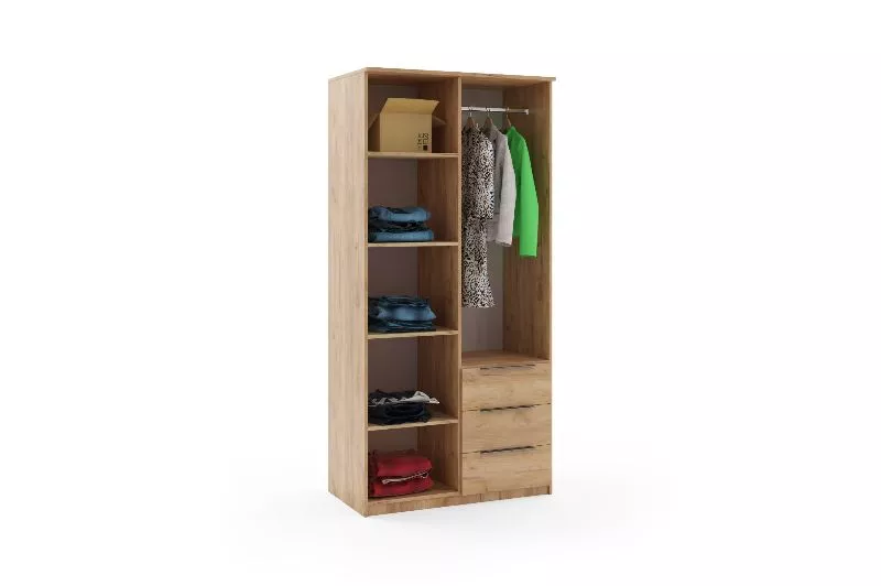 Dvoudveřová šatní skříň JANIKA se šuplíky nabízí perfektní řešení i do menších prostor. Je vybavena policemi, šatní tyčí a šuplíky. Součástí je i praktické zrcadlo, které opticky zvětší prostor.