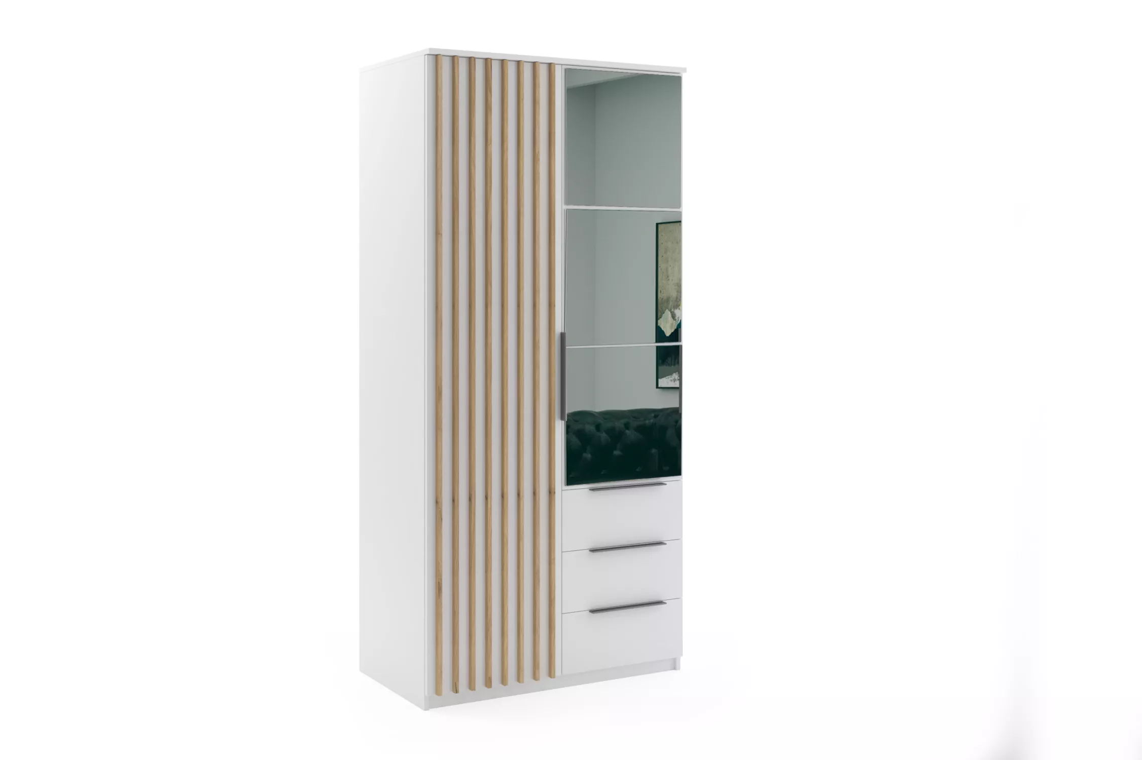 Šatní skříň ORYNA se zrcadlem se hodí do všech moderních interiérů. Zaujme především dveřmi zdobenými lamelami. Vnitřek skříně vytváří dostatek úložného prostoru v podobě šatní tyče, 4 polic a 3 šuplíků.