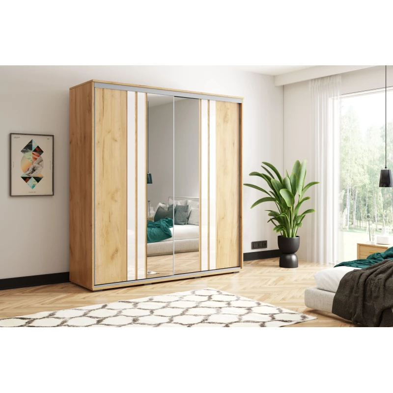 Šatní skříň PAISLEY se zrcadly se vyznačuje nejen moderním designem, ale také stabilní strukturou. Praktické posuvné dveře oceníte v boji s nedostatkem místa. Uvnitř skříně jsou police a šatní tyč.