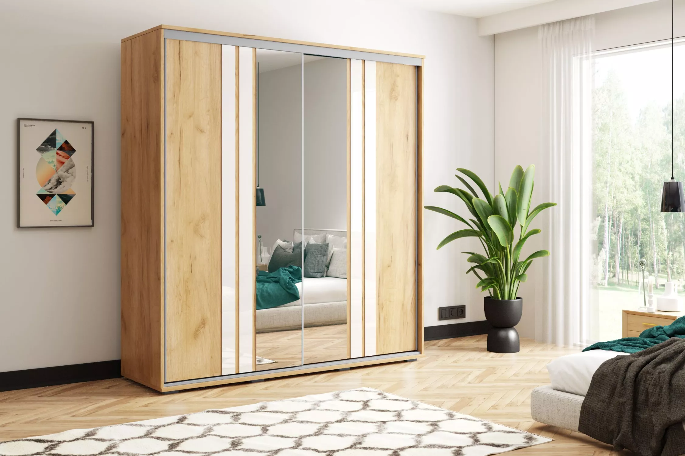 Šatní skříň PAISLEY se zrcadly se vyznačuje nejen moderním designem, ale také stabilní strukturou. Praktické posuvné dveře oceníte v boji s nedostatkem místa. Uvnitř skříně jsou police a šatní tyč.