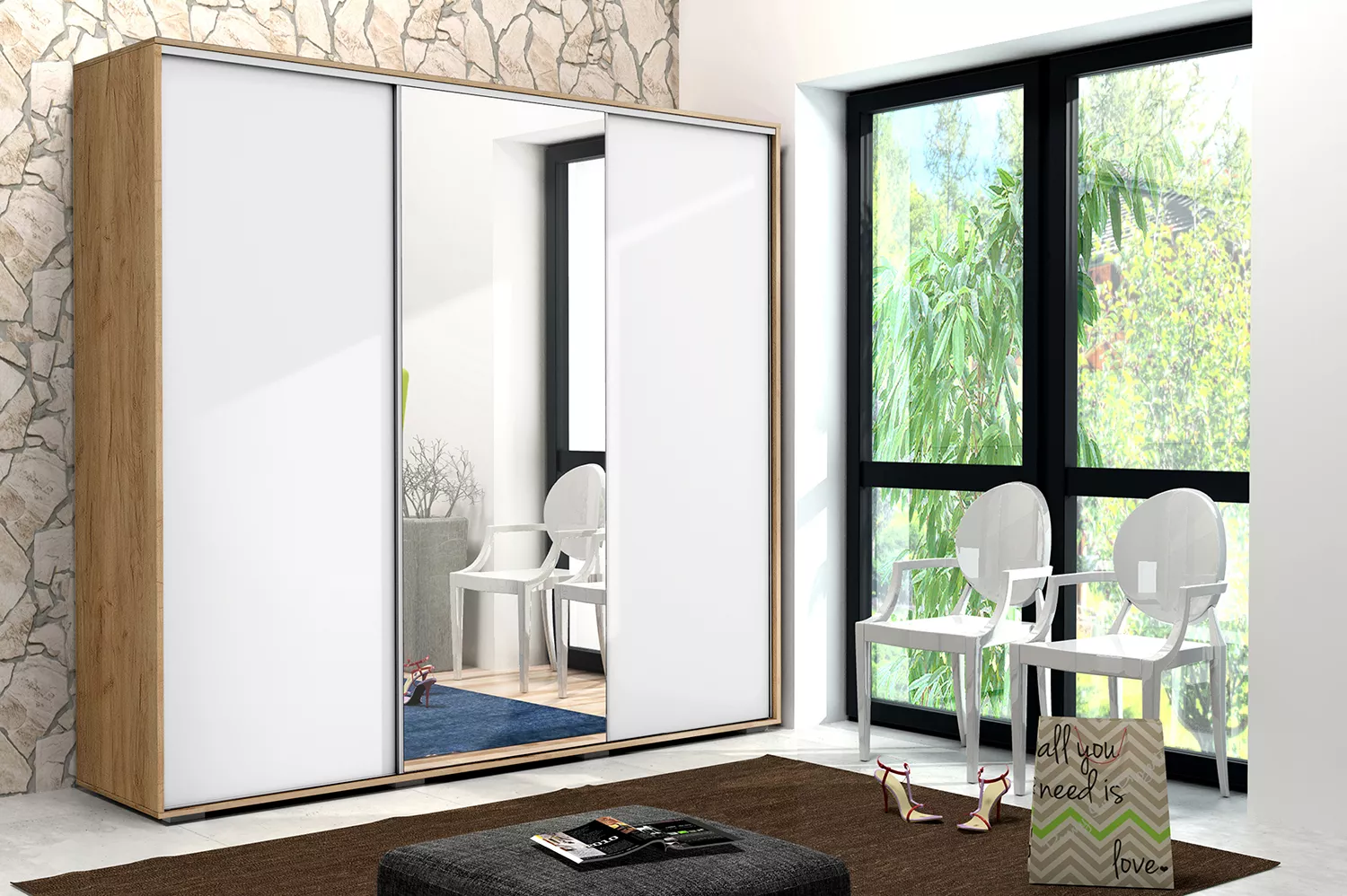 Třídveřová šatní skříň LEONARDO v moderním designu potěší oko i náročnějších zákazníků. Skříň nemá žádné výrazné úchytky, dveře se otevírají pomocí kovových lišt po stranách. Uvnitř skříně jsou police a šatní tyč.