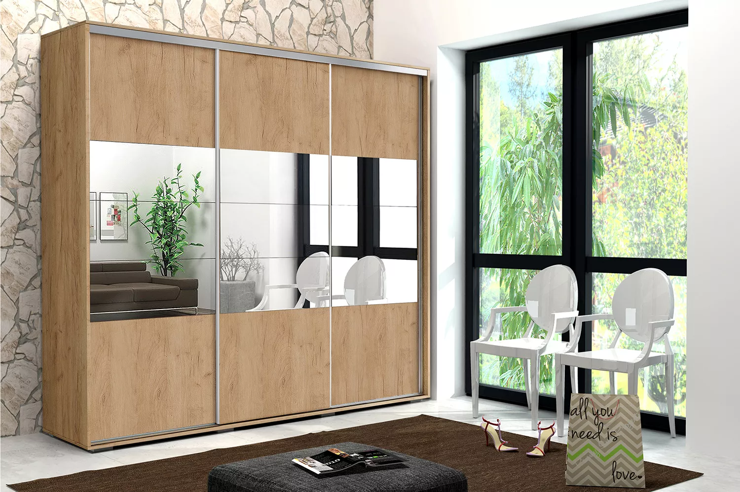 Třídveřová šatní skříň LUCA zaujme i náročné zákazníky. Hodí se do všech typů interiérů. Skříň nemá žádné výrazné úchytky, dveře se otevírají pomocí kovových lišt po stranách. Vnitřek skříně je vybaven policovým systémem a šatní tyči.