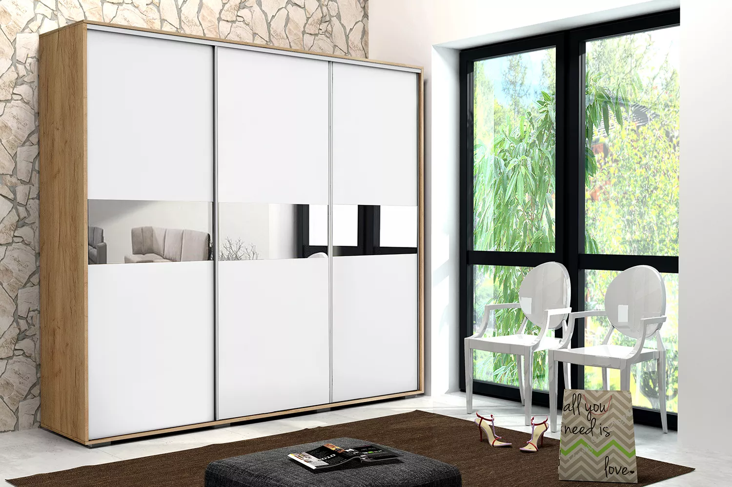Šatní skříň LUIS se zrcadlem se hodí do všech typů interiérů. Za třemi posuvnými dveřmi se ukrývá hodně úložného prostoru, který hravě pojme všechno oblečení. Skříň nemá žádné výrazné úchytky, dveře se otevírají pomocí kovových lišt po stranách.