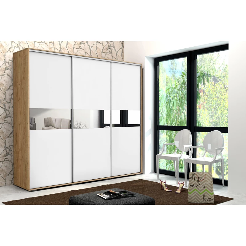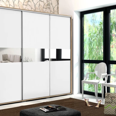 Šatní skříň LUIS se zrcadlem se hodí do všech typů interiérů. Za třemi posuvnými dveřmi se ukrývá hodně úložného prostoru, který hravě pojme všechno oblečení. Skříň nemá žádné výrazné úchytky, dveře se otevírají pomocí kovových lišt po stranách.