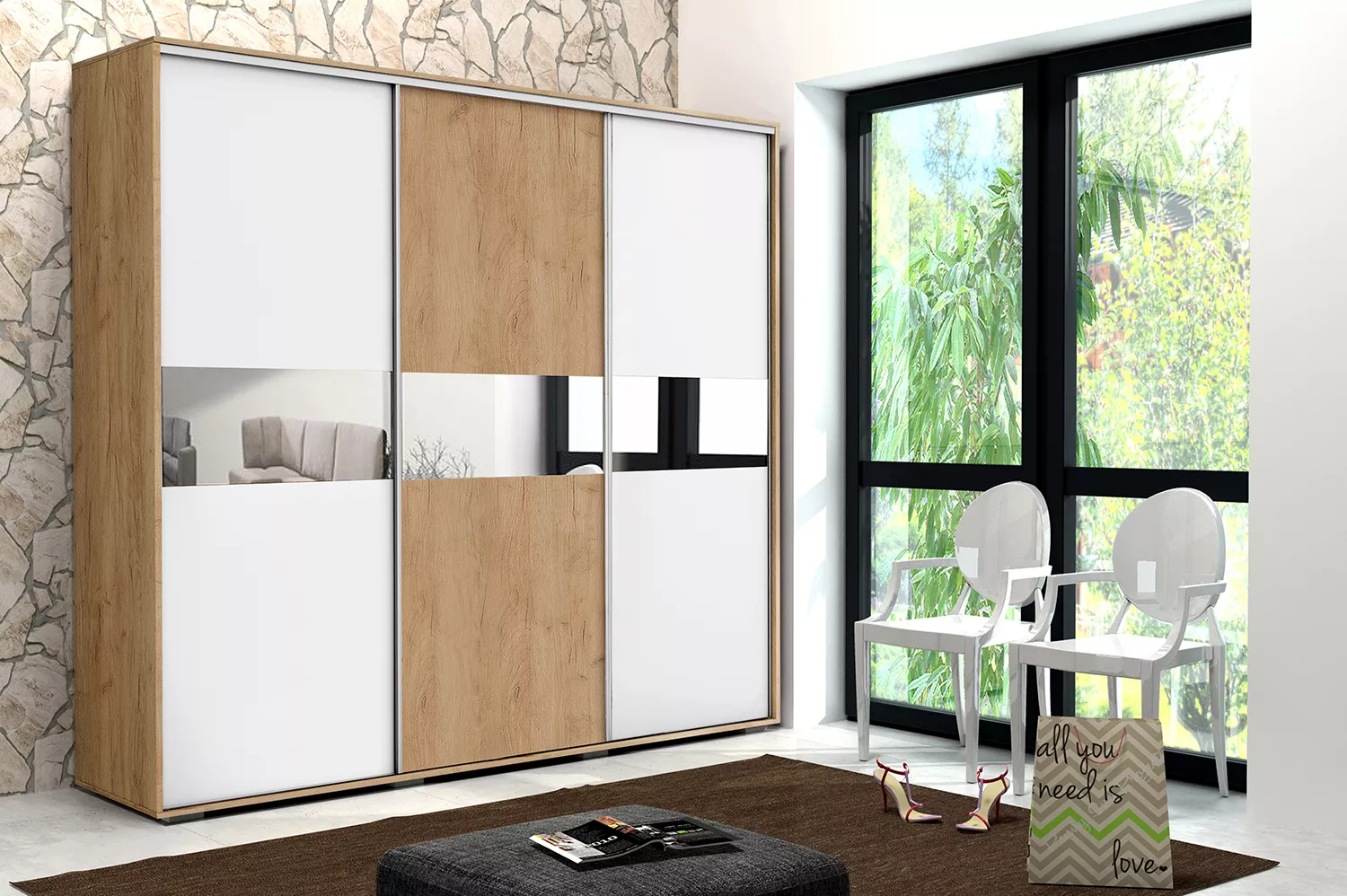 Šatní skříň LUIS se zrcadlem se hodí do všech typů interiérů. Za třemi posuvnými dveřmi se ukrývá hodně úložného prostoru, který hravě pojme všechno oblečení. Skříň nemá žádné výrazné úchytky, dveře se otevírají pomocí kovových lišt po stranách.
