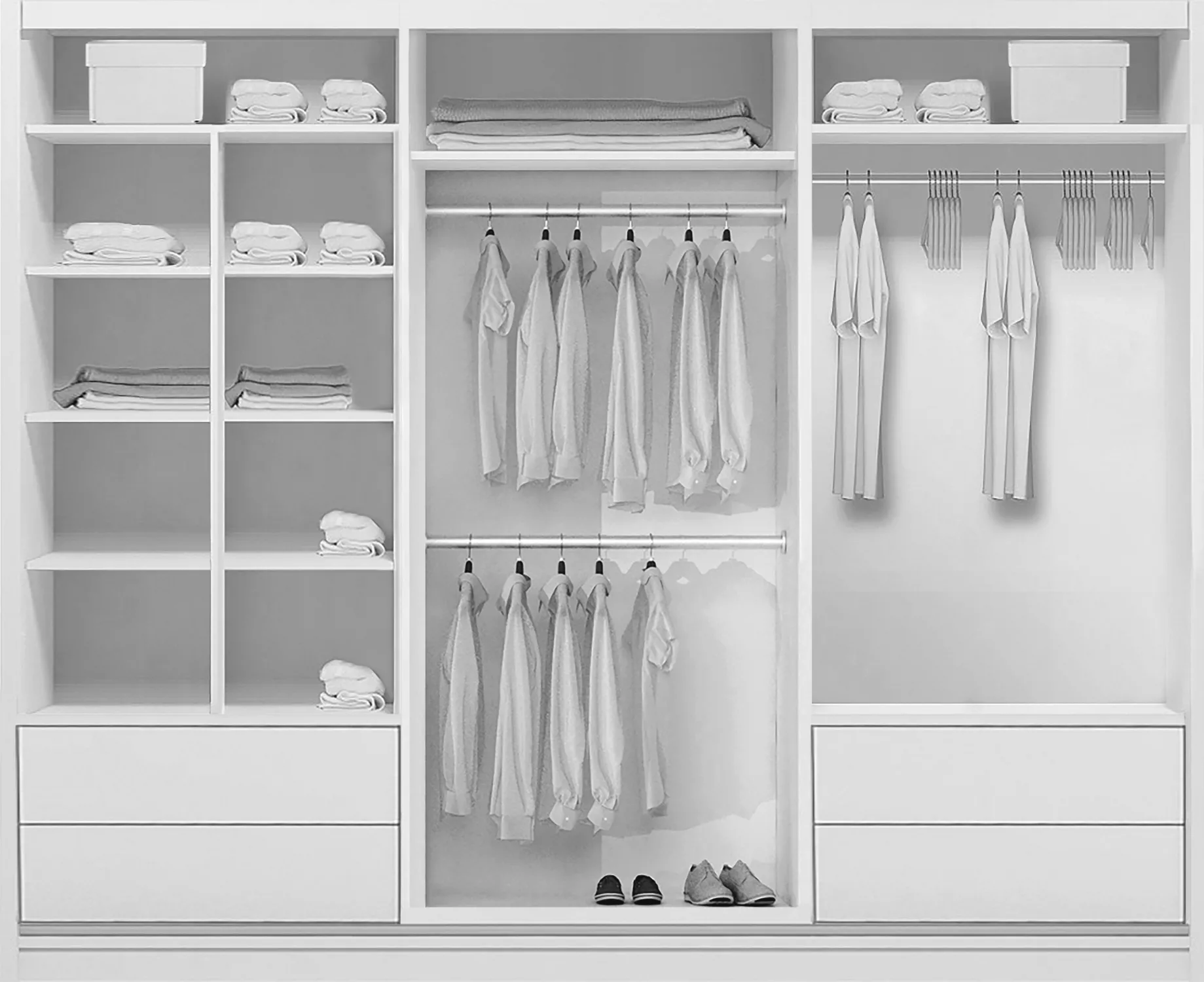 Šuplíky vyobrazené na fotografii najdete k dokoupení v sekci Doporučujeme přikoupit. Pořídíte je v setu po 2 kusech včetně vodících lišt (pojezdů). Do skříně je možné nainstalovat 2 sety šuplíků.