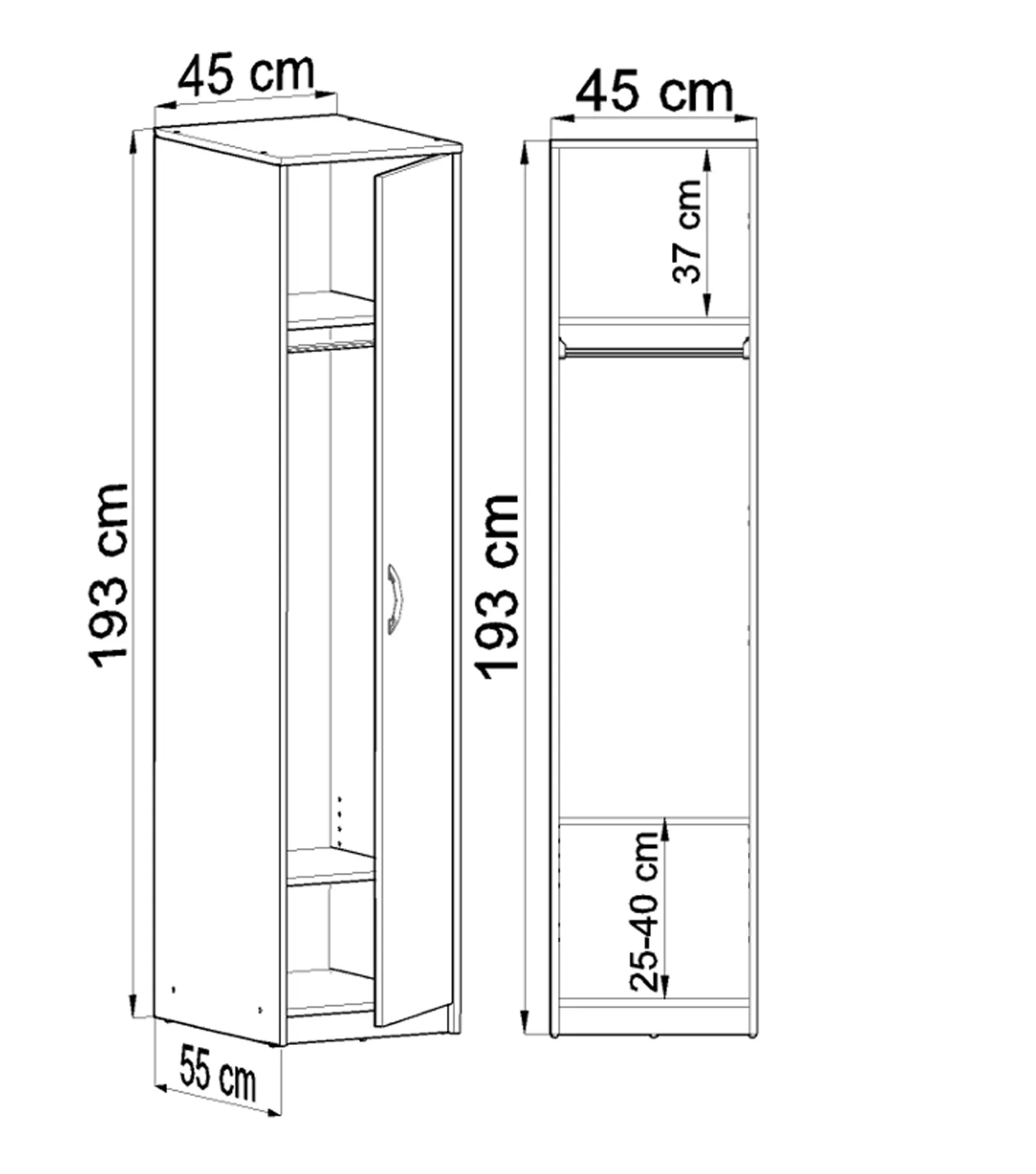 Úzká šatní skříň 45 SIMELA může být doplňkem každé ložnice nebo předsíně. Skříň je vybavena šatní tyčí a policemi.
