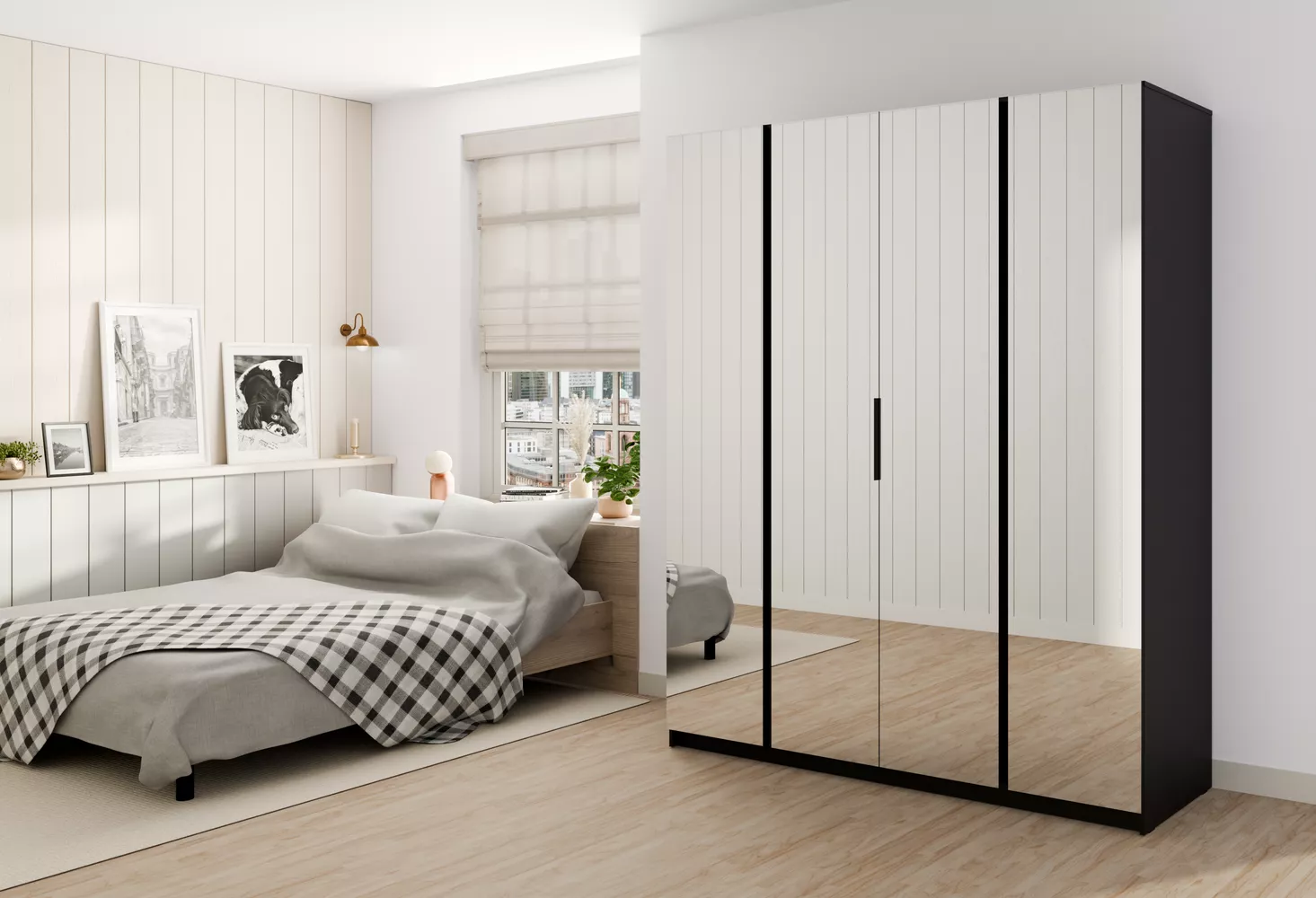 Velká zrcadlová skříň VERU se hodí do všech moderních ložnic. Kombinace polic a šatní tyče nabízí dostatek úložného prostoru pro vaše oblečení.