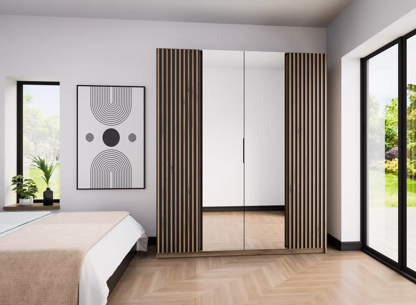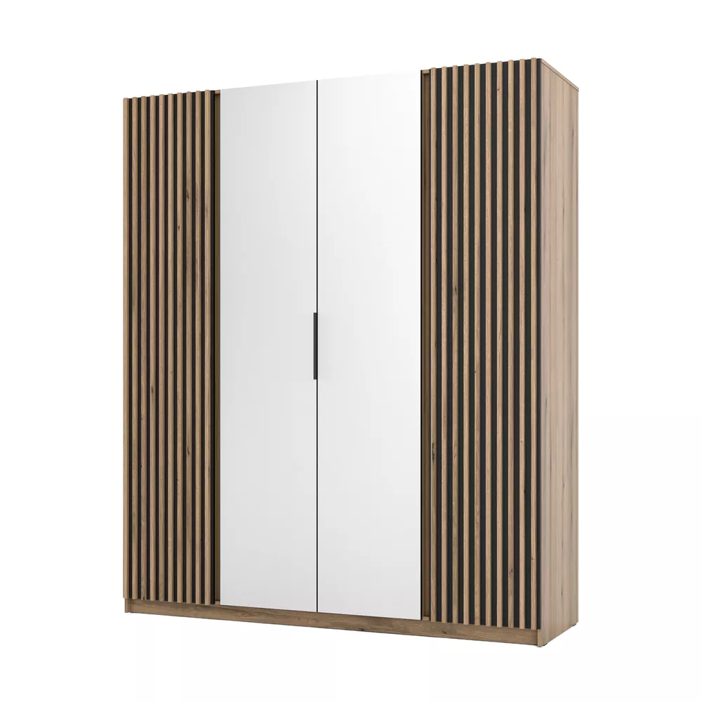 Vysoká šatní skříň VERU se zrcadly se hodí do všech moderních ložnic. Kombinace polic a šatní tyče nabízí dostatek úložného prostoru pro vaše oblečení.
