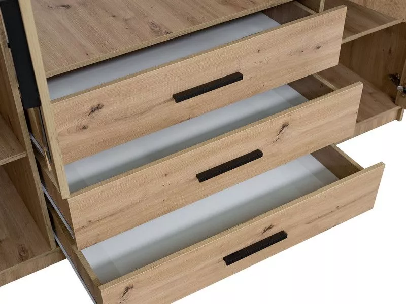 Šatní skříň NALINA se zrcadlem je široká, prostorná šatní skříň, která nabízí spoustu možností pro uložení oblečení. Součástí skříně jsou 3 široké zásuvky, věšáková tyč a 8 polic.