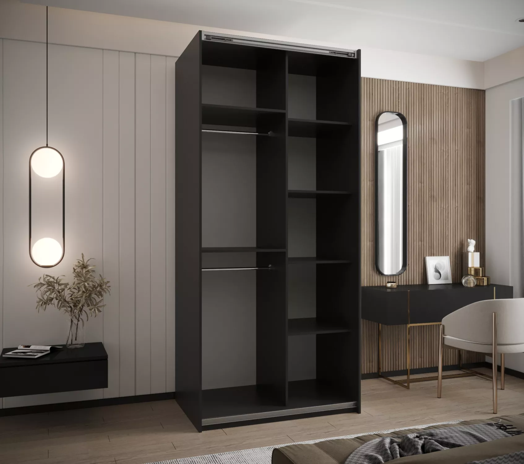 Dvoudveřová skříň SAMARA 1 představuje spojení elegance a funkcionality. Nabízí dostatek úložného prostoru v podobě policového systému a 2 šatních tyčí.