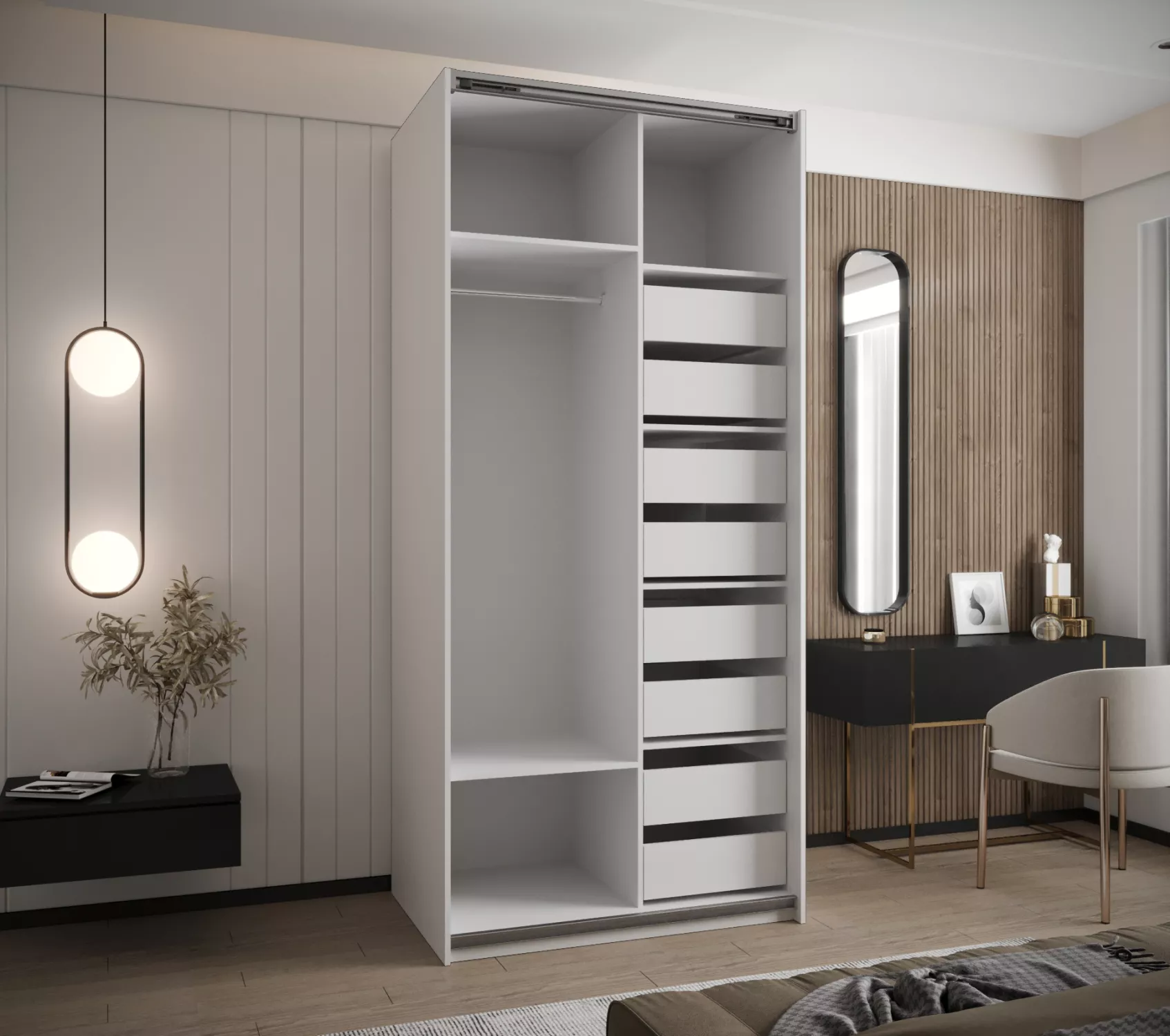 Přídavné police do skříně, šuplíky, drátěný košík a košík na boty najdete k dokoupení v sekci Doporučujeme přikoupit. Do skříně je možné nainstalovat 1 nebo 2 police a maximálně 4 sety šuplíků.