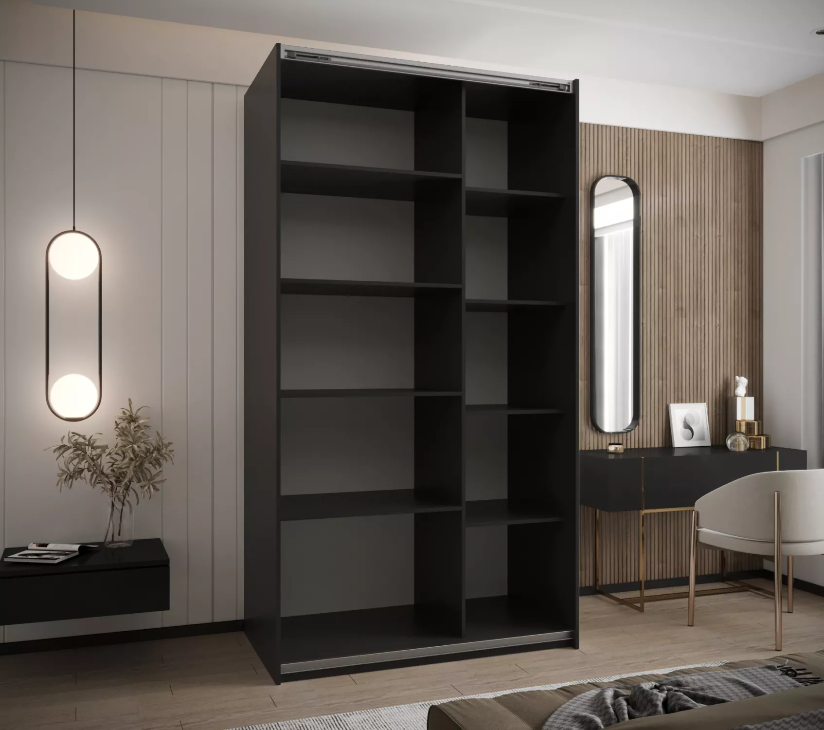 Dvoudveřová skříň SAMARA 1 představuje spojení elegance a funkcionality. Nabízí dostatek úložného prostoru v podobě policového systému a 2 šatních tyčí.