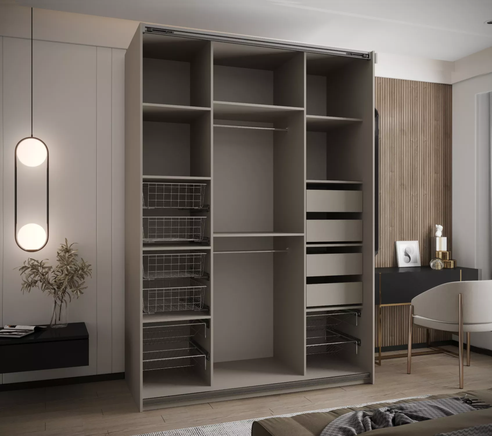 Přídavné police do skříně, šuplíky, drátěný košík a košík na boty najdete k dokoupení v sekci Doporučujeme přikoupit. Do skříně je možné nainstalovat 1 nebo 2 police a maximálně 8 setu šuplíků.