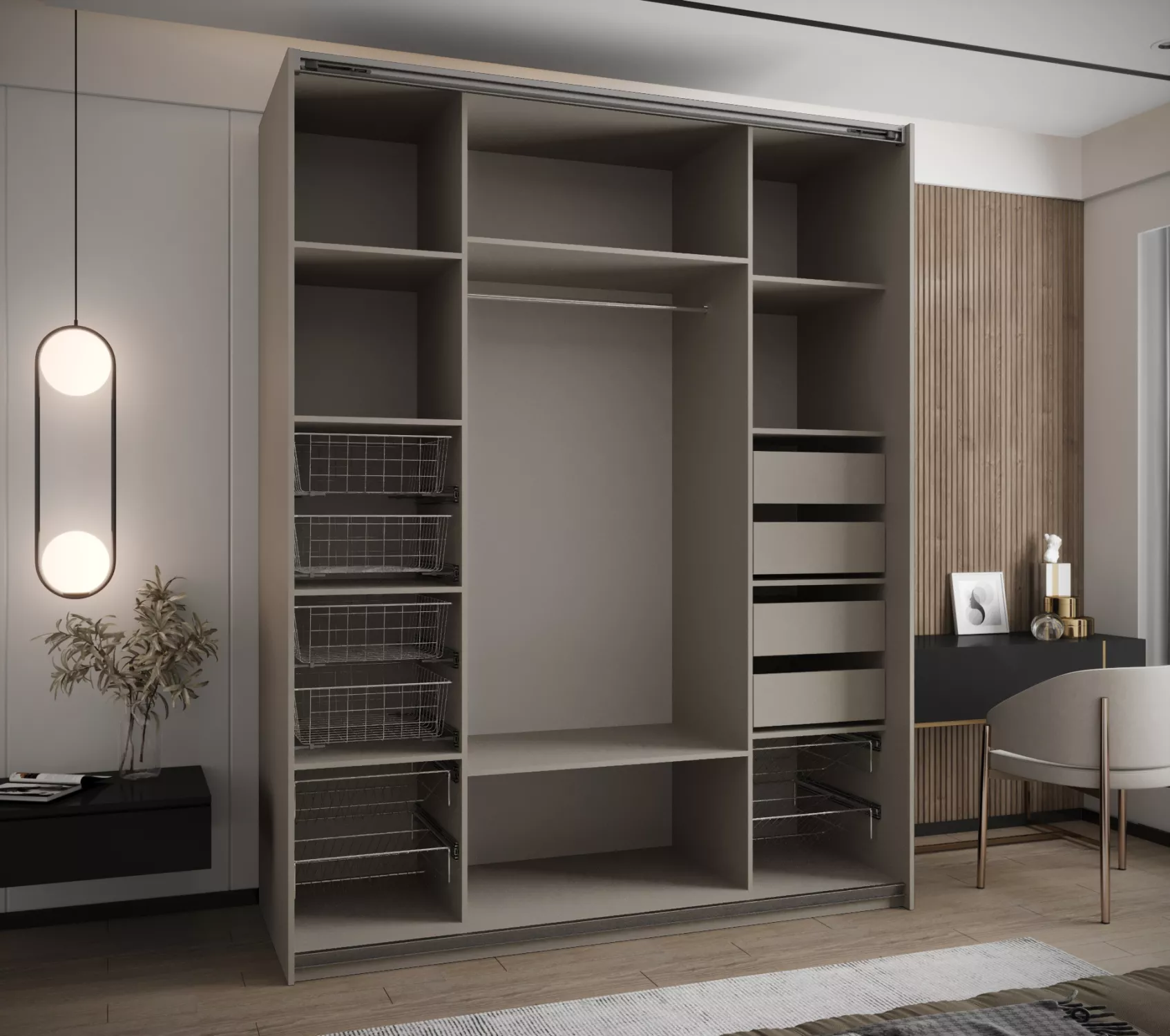 Přídavné police do skříně, šuplíky, drátěný košík a košík na boty najdete k dokoupení v sekci Doporučujeme přikoupit. Do skříně je možné nainstalovat 1 nebo 2 police a maximálně 8 setu šuplíků.