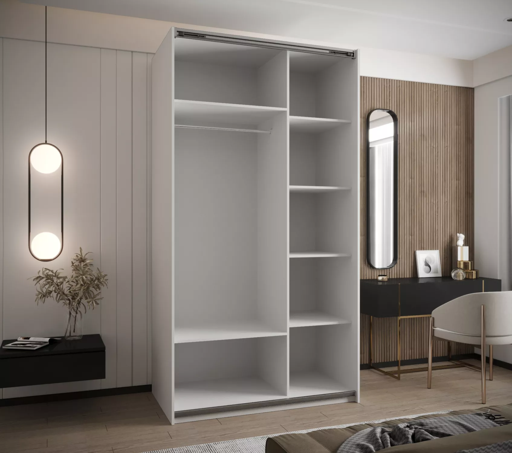 Šatní skříň SAMARA 2 – 140 představuje spojení elegance a funkcionality. Nabízí dostatek úložného prostoru v podobě policového systému a 2 šatních tyčí.