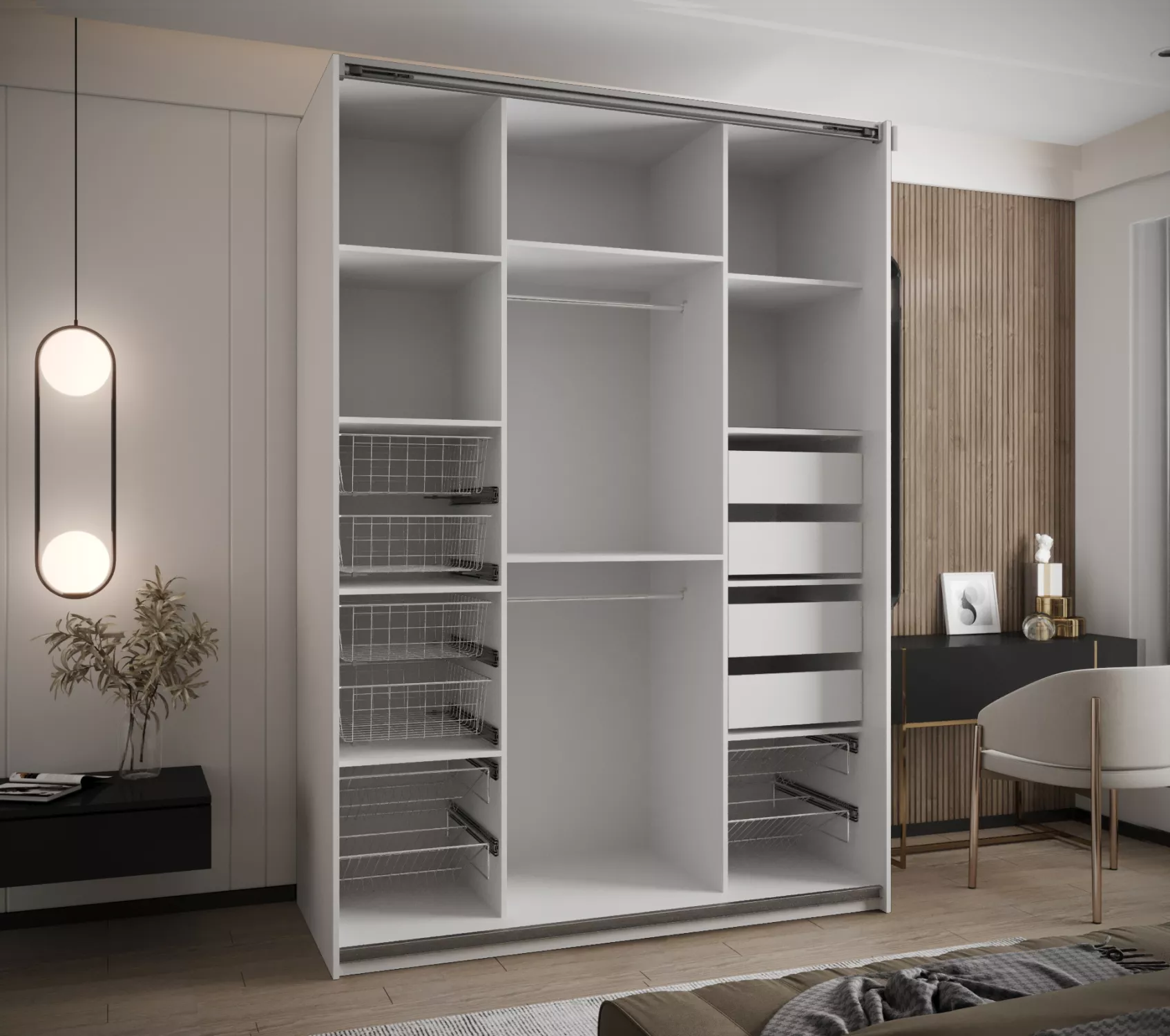 Přídavné police do skříně, šuplíky, drátěný košík a košík na boty najdete k dokoupení v sekci Doporučujeme přikoupit. Do skříně je možné nainstalovat 1 nebo 2 police a 8 setu šuplíků.