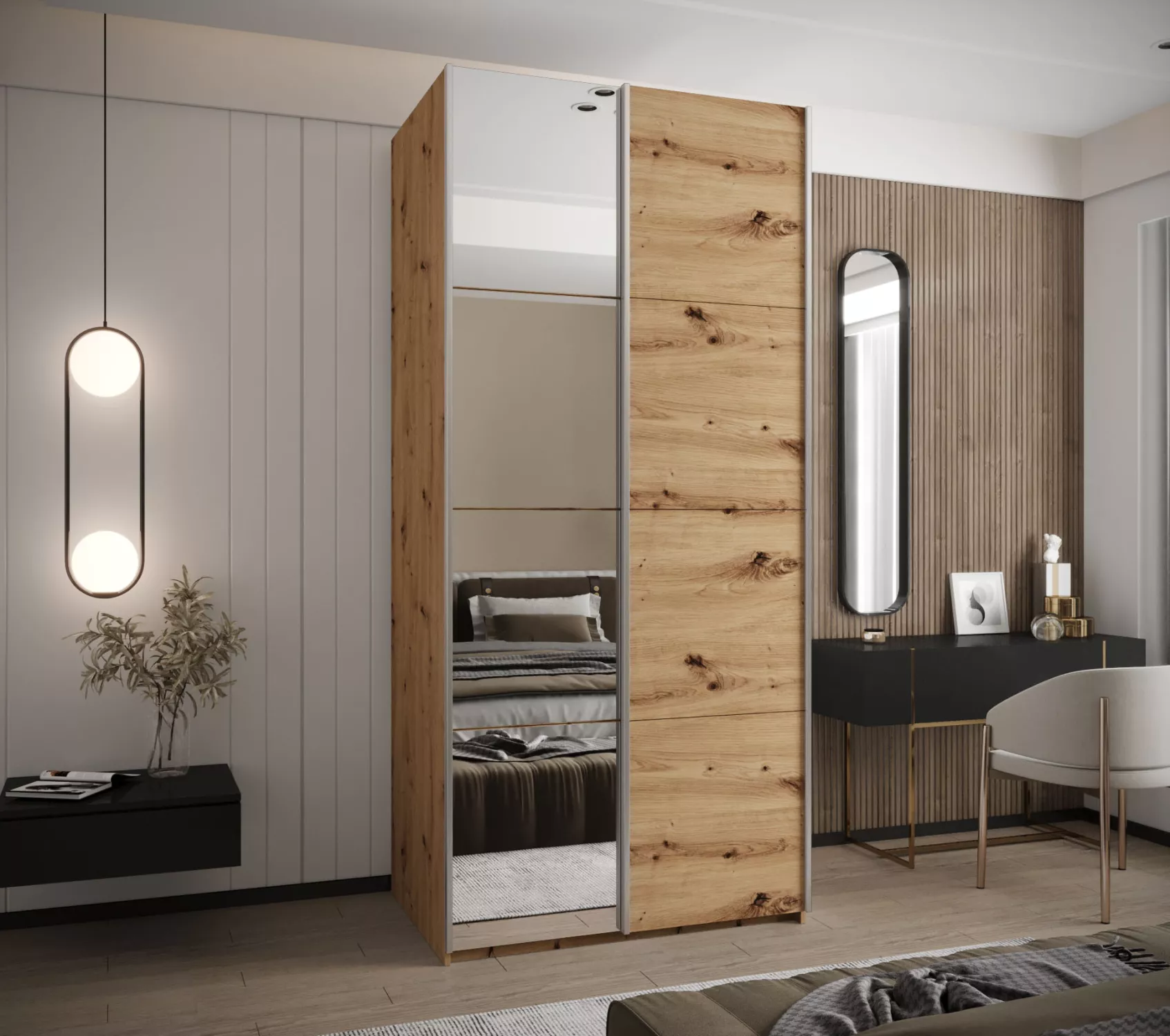 Dvoudveřová skříň SAMARA 3 - 100 představuje spojení elegance a funkcionality. Nabízí dostatek úložného prostoru v podobě policového systému a 2 šatních tyčí.