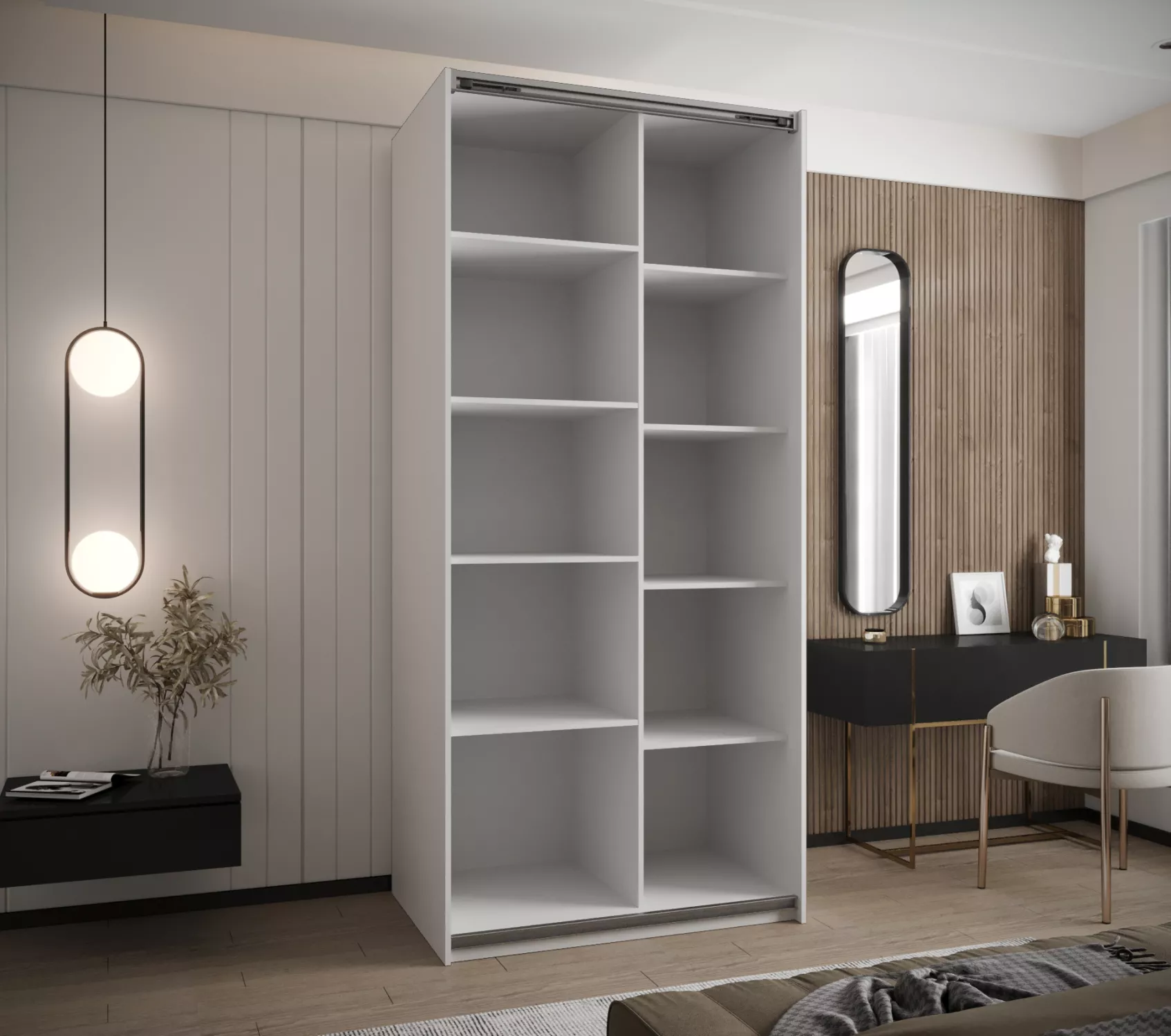 Dvoudveřová skříň SAMARA 3 - 110 představuje spojení elegance a funkcionality. Nabízí dostatek úložného prostoru v podobě policového systému a 2 šatních tyčí.