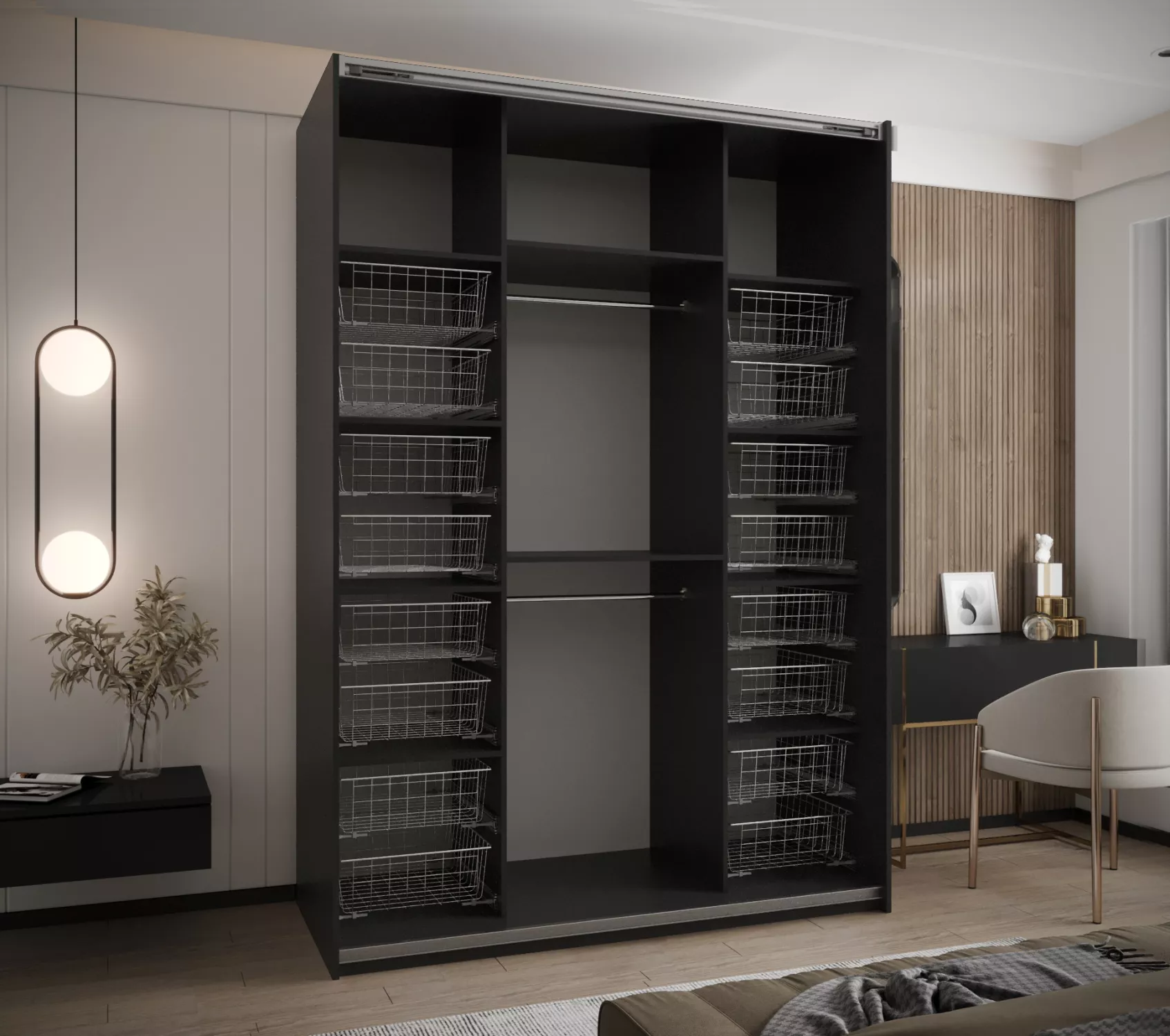 Přídavné police do skříně, šuplíky, drátěný košík a košík na boty najdete k dokoupení v sekci Doporučujeme přikoupit. Do skříně je možné nainstalovat 1 nebo 2 police a 8 setu šuplíků.